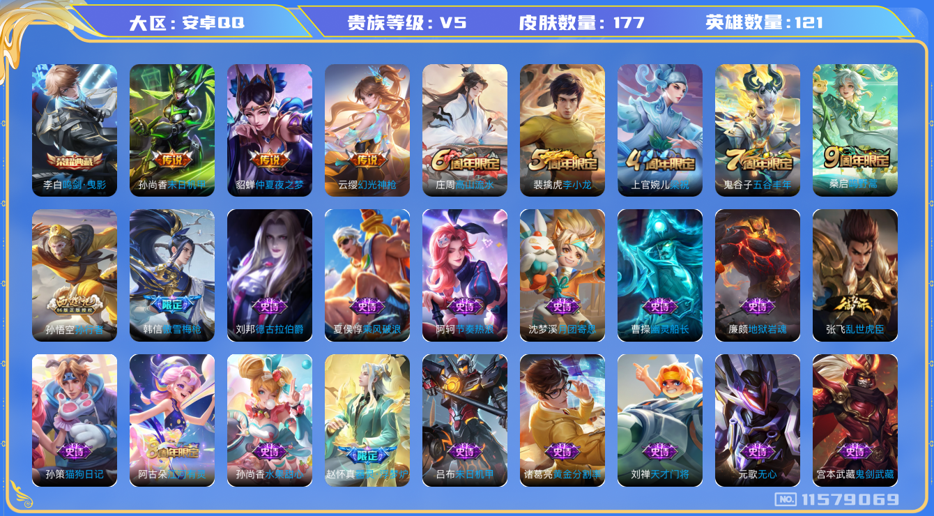 [11579069]V5 1典藏 4传说 121英雄 177皮肤 可修改实名 荣耀水晶:鸣剑·曳影 传说皮:幻光神枪,仲夏夜之梦(大飞蛾),末日机甲-孙尚香(绿蚂蚱) 珍宝阁皮:胡桃夹子,玩趣恶龙 限定皮:鸣野蒿,傲雪梅枪,高山流水,五谷丰年,梁祝,李小龙,孙行者 史诗皮:器灵·浮梦炉,黄金分割率,特工魅影,千年之狐,江河有灵,蒙恬荣光圣徽,偶像歌手,末日机甲-吕布,猫狗日记-孙策,乱世虎臣,节奏热浪,修罗,摇滚巨星,水果甜心,天才门将,星夜王子,功夫厨神,德古拉伯爵,暗隐猎兽者,幽灵船长,鬼剑武藏,心灵战警,地狱岩魂,纤云弄巧,繁星吟游(呼啦呼啦),乘风破浪,逐浪之夏,月团寄思,水晶猎龙者,金属风暴,原初追逐者,圣诞恋歌,鹰眼统帅,魅力维加斯,赏金猎手,千筹问战,无心,未来纪元-赵云