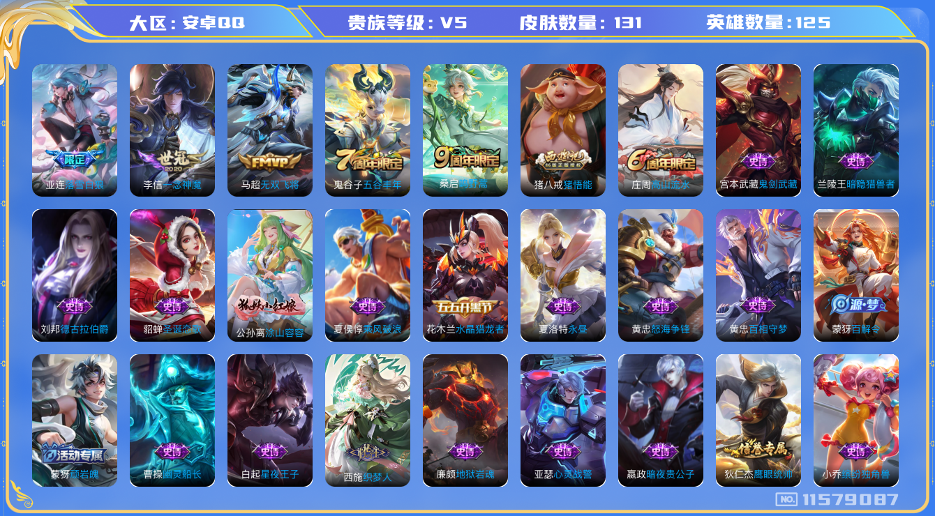 [11579087]V5 4传说 125英雄 131皮肤 可修改实名 优质装备:一念神魔,无双飞将,涂山容容 传说皮:落雪白狼 珍宝阁皮:妄想食味,玩趣恶龙 限定皮:鸣野蒿,高山流水,五谷丰年,猪悟能 史诗皮:星界战将,怒海争锋,战舞者,蒙犽顽岩魄,芈月浮光幕影,百相守梦-黄忠,织梦人,特工魅影,永昼,江河有灵,百解令(蒙犽),冰冠公主,晚萤,末日机甲-吕布,猫狗日记-孙策,水果甜心,绅士熊喵,星夜王子,德古拉伯爵,暗隐猎兽者,幽灵船长,鬼剑武藏,心灵战警,地狱岩魂,缤纷独角兽,乘风破浪,水晶猎龙者,金属风暴,圣诞狂欢,圣诞恋歌,鹰眼统帅,暗夜贵公子,魅力维加斯,无心,未来纪元-赵云