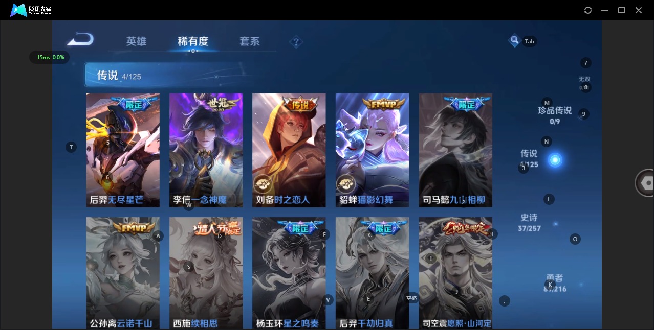 - [11941510]V8 1典藏 10传说 124英雄 210皮肤 可修改实名 优质装备:幻阙歌(貂蝉典藏),末日机甲-孙尚香(绿蚂蚱),地狱火,地狱之眼,澜逐花归海,涂山容容 传说皮:九山相柳 珍宝阁皮:玩趣恶龙 限定皮:至尊宝,凤求凰(白切鸡),武陵仙君(小桃花),飞衡(韩信年限),遇见飞天,五谷丰年,青龙志(铠年限),冰锋战神,梁祝,逐梦之音,逐梦之影,永曜之星,大圣娶亲,引擎之心,天魔缭乱 史诗皮:赞萌露比,苍鳞隐世,绮世丹青,灵蛊蚀心,龙之律动,石田雨龙,百相守梦-周瑜,幻珠鲛人,百相守梦-黄忠,紫霞仙子,白龙吟,黄金分割率,特工魅影,千年之狐,冰冠公主,偶像歌手,电玩·爆裂旋风,暗夜猫娘,龙骑士(小龙虾),末日机甲-吕布,乱世虎臣,节奏热浪,修罗,水果甜心,绅士熊喵,心灵骇客,暗隐猎兽者,鬼剑武藏,地狱岩魂,逐浪之夏,水晶猎龙者,曙光守护者,箭羽风息,金属风暴,原初追逐者,圣诞恋歌,鹰眼统帅,魅力维加斯,未来纪元-赵云