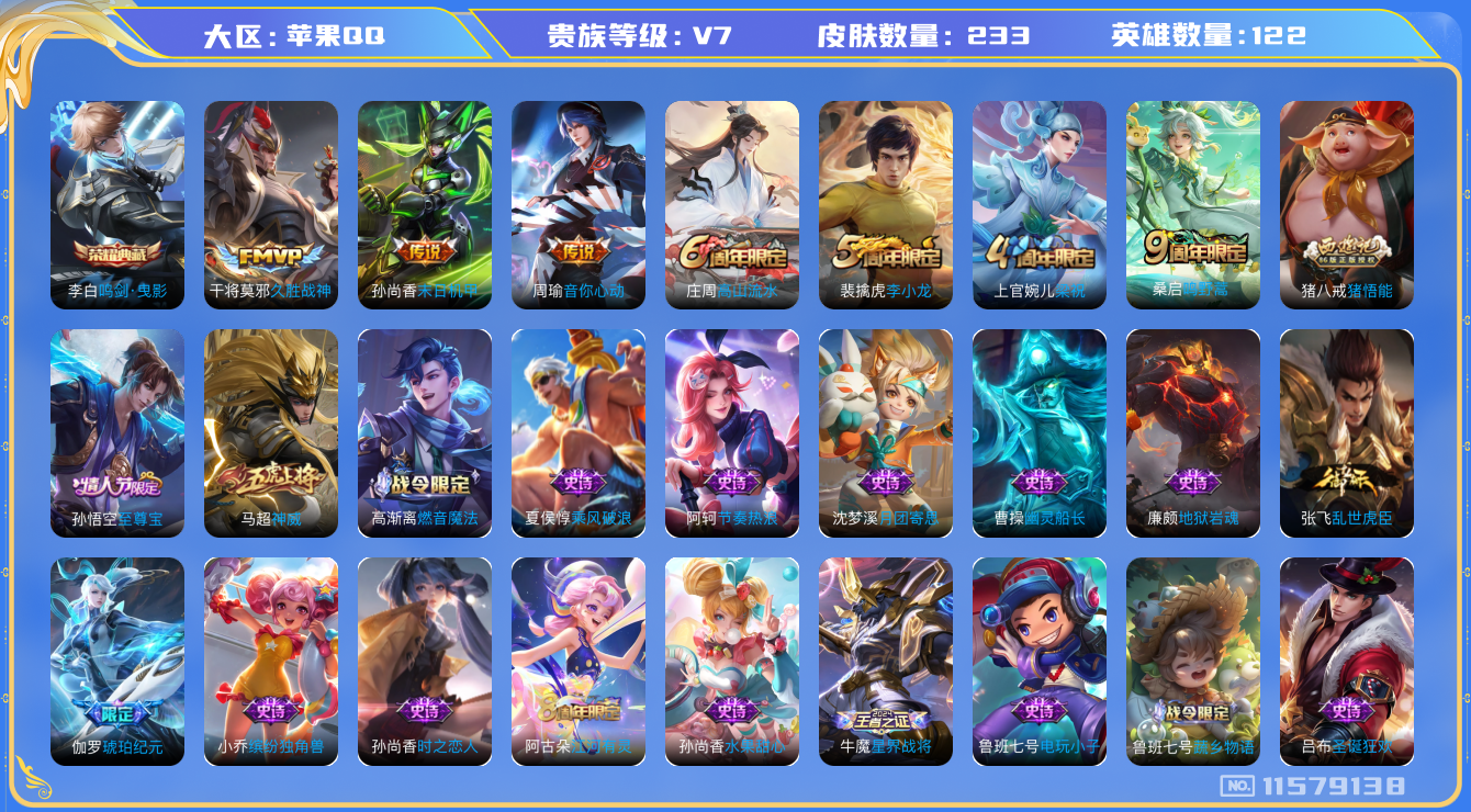 [11579138]V7 1典藏 4传说 122英雄 233皮肤 可修改实名 荣耀水晶:鸣剑·曳影 传说皮:末日机甲-孙尚香(绿蚂蚱),久胜战神,音你心动-周瑜 珍宝阁皮:妄想食味,女武神,玩趣恶龙 限定皮:鸣野蒿,至尊宝,神威(电光马子),高山流水,梁祝,李小龙,猪悟能 史诗皮:星界战将,蒙犽顽岩魄,蔬乡物语(鲁班七号),琥珀纪元伽罗,紫霞仙子,电玩小子(小书包),白龙吟,黄金分割率,特工魅影,江河有灵,高渐离燃音魔法,百解令(蒙犽),蒙恬荣光圣徽,冰冠公主,偶像歌手,末日机甲-吕布,时之恋人-孙尚香,乱世虎臣,节奏热浪,修罗,摇滚巨星,水果甜心,绅士熊喵,心灵骇客,功夫厨神,暗隐猎兽者,幽灵船长,鬼剑武藏,心灵战警,舞动绿茵,地狱岩魂,纤云弄巧,缤纷独角兽,乘风破浪,逐浪之夏,月团寄思,水晶猎龙者,热力回旋,金属风暴,原初追逐者,圣诞狂欢,圣诞恋歌,鹰眼统帅,魅力维加斯,黎明之约