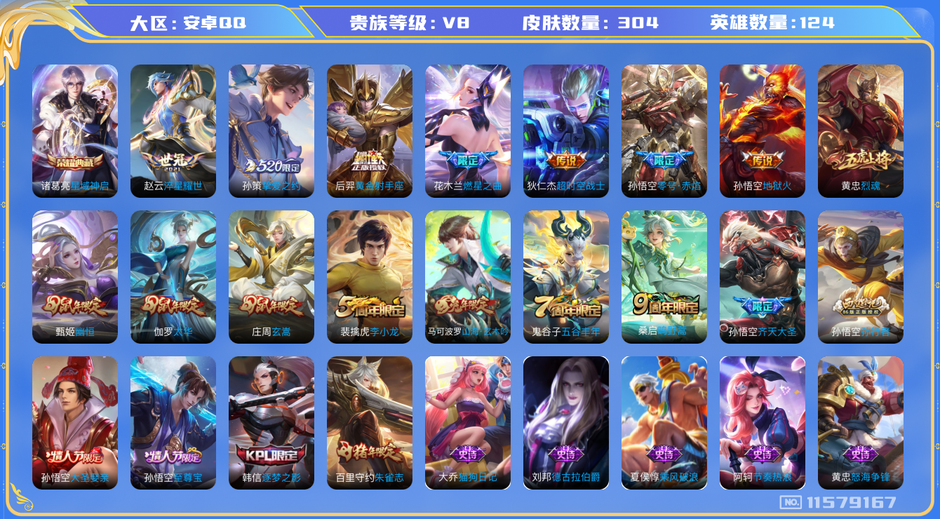 [11579167]V8 1典藏 11传说 124英雄 304皮肤 可修改实名 荣耀水晶:星域神启(倪克斯贼亮) 传说皮:黄金射手座,零号·赤焰,地狱火,淬星耀世,超时空战士-狄仁杰,挚爱之约,燃星之曲 珍宝阁皮:优雅恋人,女武神 限定皮:鸣野蒿,至尊宝,太华(伽罗年限),玄嵩(庄周年限),齐天大圣,五谷丰年,幽恒(沐浴露),烈魂,李小龙,逐梦之影,朱雀志(守约年限),孙行者,大圣娶亲,山海·玄木吟(马可年限) 史诗皮:星界战将,龙之律动,东方月初,蒙犽顽岩魄,芈月浮光幕影,怒海争锋,蔬乡物语(鲁班七号),破空之剑,遇见神鹿,电玩小子(小书包),黄金分割率,特工魅影,千年之狐,蒙恬荣光圣徽,青蛇,偶像歌手,电玩·爆裂旋风,龙骑士(小龙虾),末日机甲-吕布,猫狗日记-孙策,猫狗日记-大乔,时之恋人-孙尚香,节奏热浪,女仆咖啡,摇滚巨星,水果甜心,绅士熊喵,天才门将,心灵骇客,功夫厨神,德古拉伯爵,暗隐猎兽者,幽灵船长,鬼剑武藏,心灵战警,地狱岩魂,纤云弄巧,繁星吟游(呼啦呼啦),缤纷独角兽,乘风破浪,逐浪之夏,水晶猎龙者,曙光守护者,箭羽风息,金属风暴,原初追逐者,圣诞狂欢,圣诞恋歌,鹰眼统帅,黎明之约,无心,未来纪元-赵云