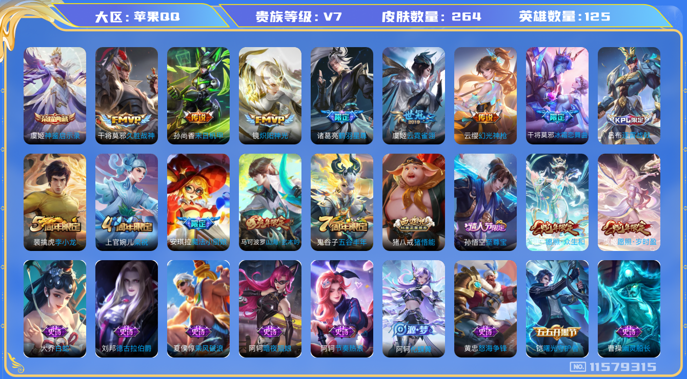 [11579315]V7 1典藏 8传说 125英雄 264皮肤 可修改实名 优质装备:神鉴启示录,久胜战神,炽阳神光,云霓雀翎,末日机甲-孙尚香(绿蚂蚱),鹤羽星尊 传说皮:幻光神枪 珍宝阁皮:胡桃夹子,玩趣恶龙 限定皮:愿照·岁时盈(虞姬年限),愿照·众生和(妲己年限),逐霄战戟,至尊宝,魔法小厨娘,五谷丰年,梁祝,李小龙,猪悟能,冰霜恋舞曲,山海·玄木吟(马可年限) 史诗皮:鸭鸭历险记-刘禅,狼魂孤将,绮世丹青,化蝶舞,星界战将,龙之律动,雪豹·霜爪,石田雨龙,茶境仙,怒海争锋,上官婉儿群星魔术团,紫霞仙子,黄金分割率,特工魅影,千年之狐,电玩·爆裂旋风,蒙恬荣光圣徽,白蛇,暗夜猫娘,晚萤,末日机甲-吕布,乱世虎臣,节奏热浪,女仆咖啡,摇滚巨星,水果甜心,绅士熊喵,星夜王子,心灵骇客,功夫厨神,德古拉伯爵,暗隐猎兽者,幽灵船长,鬼剑武藏,乐园奇幻夜,地狱岩魂,纤云弄巧,繁星吟游(呼啦呼啦),乘风破浪,逐浪之夏,水晶猎龙者,曙光守护者,金属风暴,原初追逐者,圣诞狂欢,圣诞恋歌,鹰眼统帅,魅力维加斯,黎明之约,无心,未来纪元-赵云