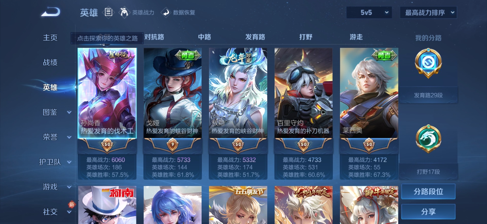 - PX_2093861-贵族等级: V4 英雄数: 53 皮肤数: 17 传说皮: 澜逐花归海 限定皮: 逐霄战戟