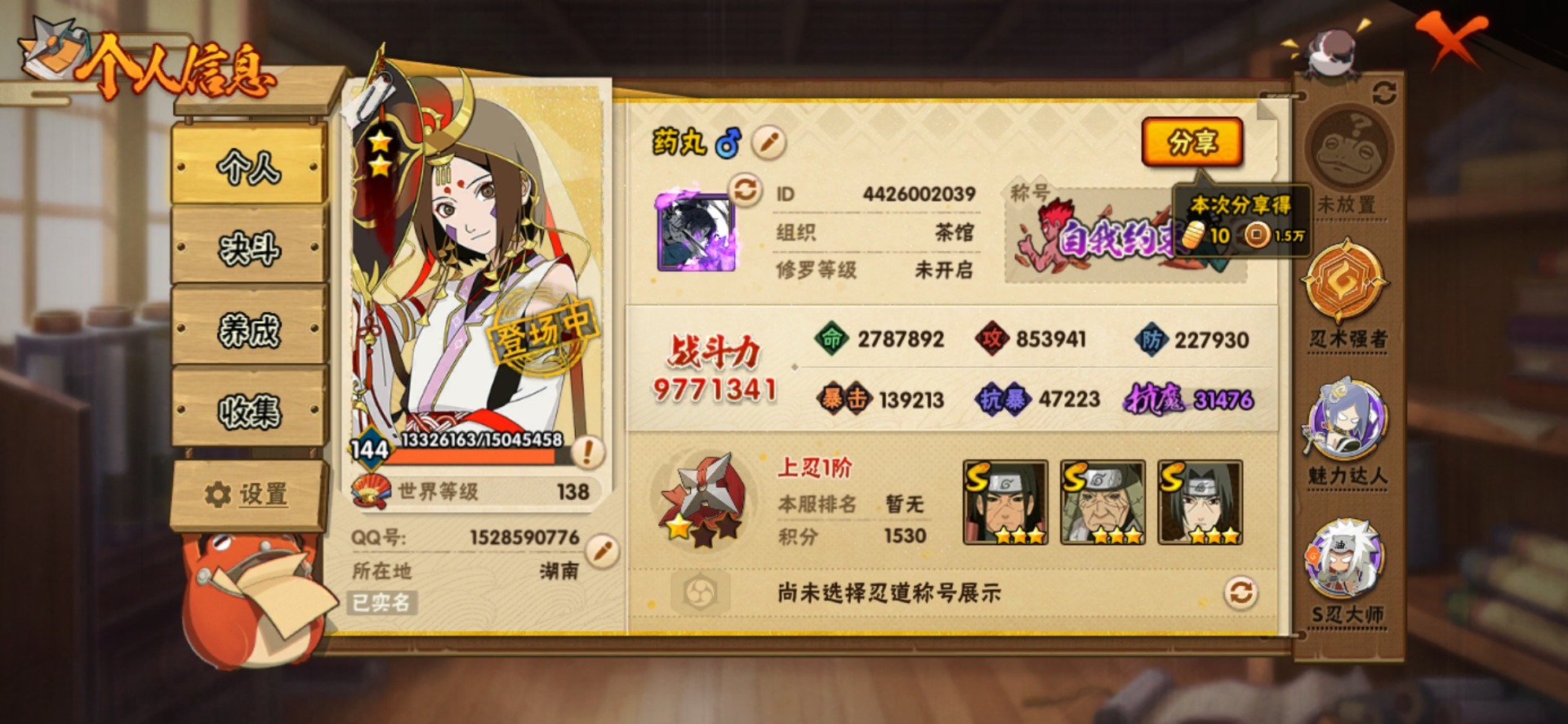 [11579324]V13 20S忍 41A忍 977.1W战力 可二次 可修改实名 S级忍者:艾「忍界大战」,宇智波斑「秽土转生·解」,宇智波佐助「永恒万花筒」,神秘面具男 「红夜之刃」,漩涡鸣人 「九喇嘛连结」,大野木 「忍界大战」,迈特凯「死门」,宇智波斑 「木叶创立」,宇智波带土 「忍界大战」,千手柱间「秽土转生」,自来也 「舞之豪杰」,旗木卡卡西「须佐能乎」,宇智波鼬「秽土转生」,“宇智波斑” 「白面具」,猿飞日斩「秽土转生」,宇智波鼬 「须佐能乎」,佩恩「天道」,波风水门,大蛇丸,纲手