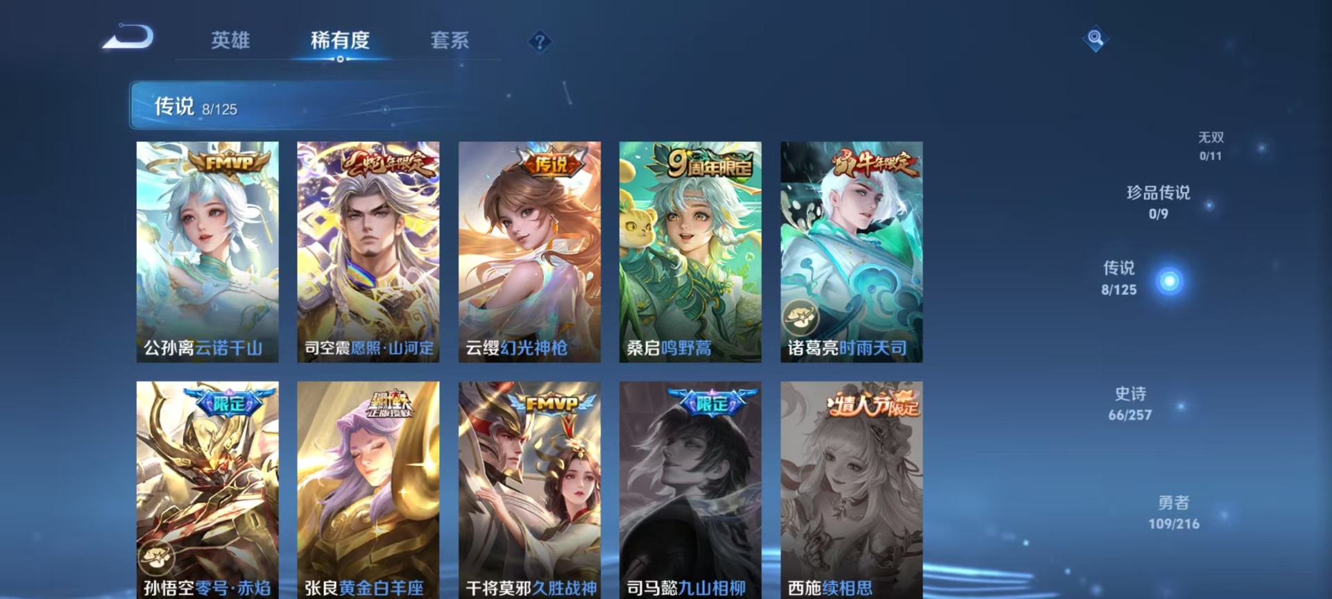[11579330]V7 1典藏 8传说 124英雄 229皮肤 可修改实名 荣耀水晶:鸣剑·曳影 传说皮:云诺千山,幻光神枪,黄金白羊座,零号·赤焰,久胜战神 珍宝阁皮:妄想食味,玩趣恶龙 限定皮:愿照·山河定(司空震年限),逐霄战戟,鸣野蒿,时雨天司(水龙头),遇见飞天,五谷丰年 史诗皮:星界战将,茶境仙,器灵·浮梦炉,鸭鸭历险记-刘禅,龙之律动,百相守梦-百里守约,百相守梦-黄忠,蒙犽顽岩魄,蔬乡物语(鲁班七号),化蝶舞,破空之剑,紫霞仙子,特工魅影,千年之狐,江河有灵,高渐离燃音魔法,百解令(蒙犽),蒙恬荣光圣徽,冰冠公主,白蛇,暗夜猫娘,末日机甲-吕布,猫狗日记-大乔,节奏热浪,修罗,女仆咖啡,水果甜心,天才门将,星夜王子,心灵骇客,功夫厨神,德古拉伯爵,暗隐猎兽者,幽灵船长,鬼剑武藏,心灵战警,乐园奇幻夜,舞动绿茵,地狱岩魂,纤云弄巧,拒霜思,缤纷独角兽,逐浪之夏,水晶猎龙者,曙光守护者,金属风暴,原初追逐者,圣诞狂欢,鹰眼统帅,暗夜贵公子,黎明之约,未来纪元-赵云