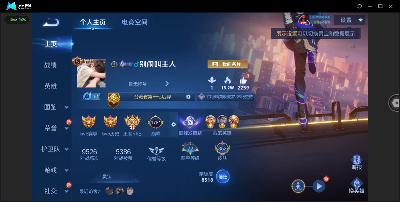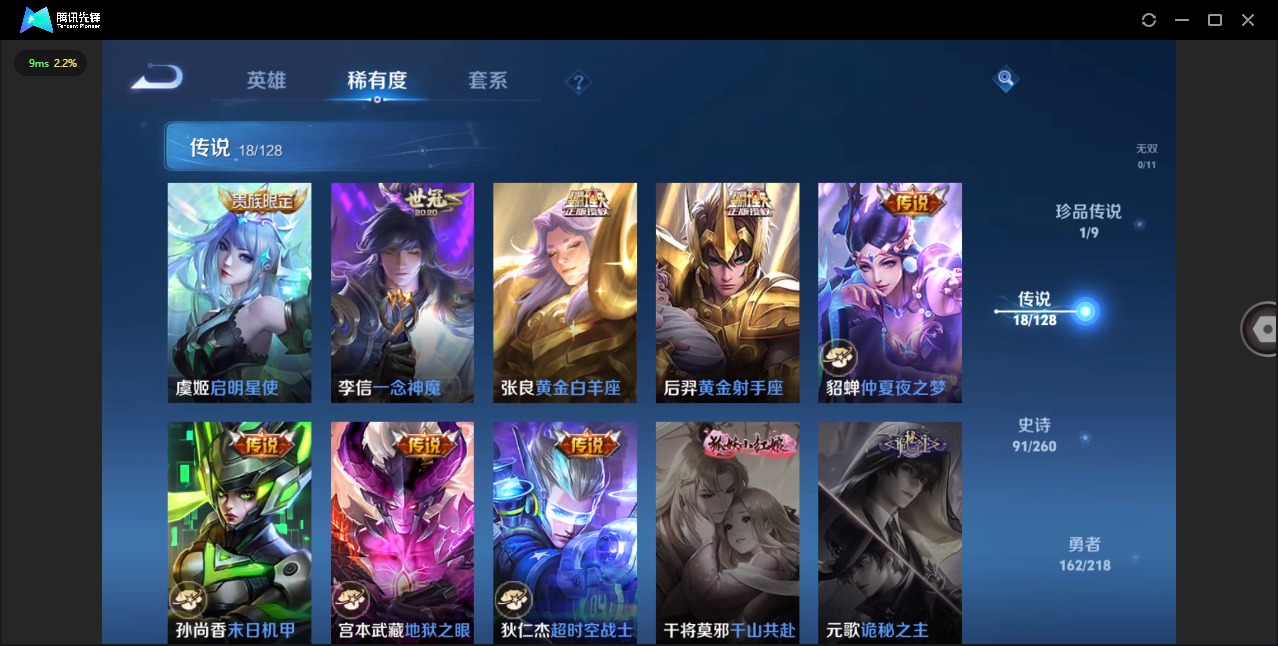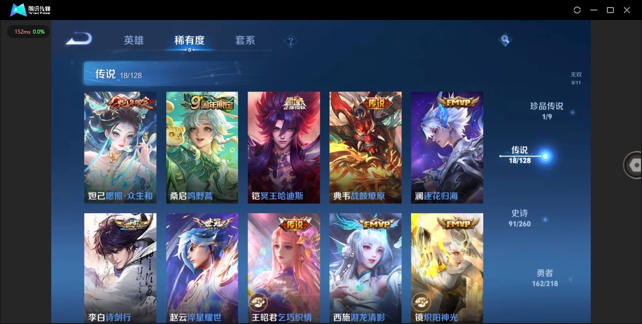- [12031478]V10 8典藏 24传说 124英雄 381皮肤 可修改实名 优质装备:天鹅之梦(小乔典藏),无限飓风号(高达),活力突击,杀手不太冷,鸣剑·曳影,星域神启(倪克斯贼亮),幻阙歌(貂蝉典藏),最初的交响(伽罗典藏),黄金射手座,冠军飞将,云鹰飞将(小将军),久胜战神,炽阳神光,一念神魔,云霓雀翎,末日机甲-孙尚香(绿蚂蚱),地狱火,仲夏夜之梦(大飞蛾),游龙清影(小青龙),淬星耀世,音你闪耀(rap皮),艾琳觅芳踪,千劫归真,涂山容容 传说皮:幻光神枪 珍宝阁皮:万物之道,优雅恋人,蔷薇恋人,女武神 限定皮:愿照·众生和(妲己年限),鸣野蒿,至尊宝,白虎志(电光耗子),凤求凰(白切鸡),太华(伽罗年限),武陵仙君(小桃花),傲雪梅枪,时之彼端,神威(电光马子),飞衡(韩信年限),遇见飞天,高山流水,五谷丰年,冰锋战神,游园惊梦,梁祝,逐梦之星,岱宗(典韦年限),李小龙,逐梦之影,天魔缭乱,青春决赛季,匿光追影者,女儿国国王 史诗皮:器灵·浮梦炉,灵蛊蚀心,龙之律动,石田雨龙,茶境仙,百相守梦-黄忠,织梦人,遇见神鹿,紫霞仙子,苍穹之光,电玩小子(小书包),白龙吟,黄金分割率,特工魅影,千年之狐,魅语,高渐离燃音魔法,无限星赏官,冰冠公主,青蛇,偶像歌手,白蛇,晚萤,暗夜猫娘,龙骑士(小龙虾),末日机甲-吕布,猫狗日记-孙策,猫狗日记-大乔,时之恋人-孙尚香,乱世虎臣,节奏热浪,修罗,女仆咖啡,摇滚巨星,水果甜心,绅士熊喵,天才门将,星夜王子,心灵骇客,时之奇旅-安琪拉,功夫厨神,德古拉伯爵,暗隐猎兽者,幽灵船长,鬼剑武藏,暗渊魔法,心灵战警,天秀·启明,舞动绿茵,地狱岩魂,诗语江南,纤云弄巧,繁星吟游(呼啦呼啦),拒霜思,缤纷独角兽,乘风破浪,逐浪之夏,龙鼓争鸣,月团寄思,水晶猎龙者,曙光守护者,箭羽风息,金属风暴,原初追逐者,圣诞狂欢,圣诞恋歌,鹰眼统帅,暗夜贵公子,魅力维加斯,黎明之约,赏金猎手,无心,未来纪元-赵云