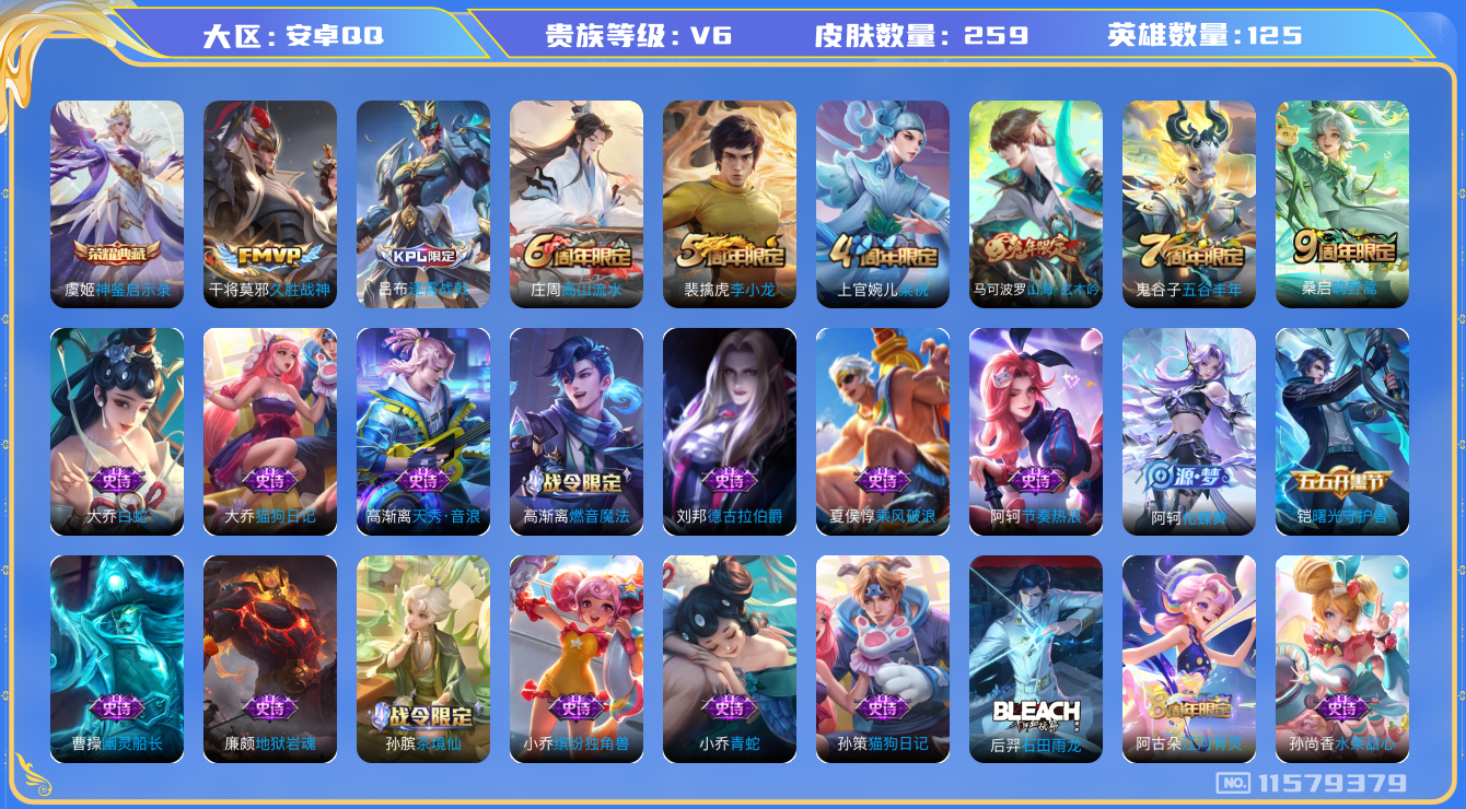 [11579379]V6 1典藏 2传说 125英雄 259皮肤 可修改实名 荣耀水晶:神鉴启示录 传说皮:久胜战神 珍宝阁皮:万物之道,优雅恋人,玩趣恶龙 限定皮:逐霄战戟,鸣野蒿,高山流水,五谷丰年,梁祝,李小龙,山海·玄木吟(马可年限) 史诗皮:星界战将,茶境仙,鸭鸭历险记-刘禅,龙之律动,石田雨龙,百相守梦-百里守约,战舞者,蒙犽顽岩魄,蔬乡物语(鲁班七号),化蝶舞,破空之剑,紫霞仙子,特工魅影,千年之狐,江河有灵,高渐离燃音魔法,雪夜绮愿(周瑜),百解令(蒙犽),蒙恬荣光圣徽,冰冠公主,青蛇,偶像歌手,无限星赏官,魅语,白蛇,电玩·爆裂旋风,龙骑士(小龙虾),猫狗日记-孙策,猫狗日记-大乔,节奏热浪,女仆咖啡,摇滚巨星,水果甜心,天才门将,星夜王子,心灵骇客,功夫厨神,德古拉伯爵,暗隐猎兽者,幽灵船长,鬼剑武藏,心灵战警,乐园奇幻夜,天秀·启明,舞动绿茵,地狱岩魂,纤云弄巧,拒霜思,缤纷独角兽,乘风破浪,逐浪之夏,水晶猎龙者,曙光守护者,金属风暴,原初追逐者,圣诞狂欢,圣诞恋歌,鹰眼统帅,暗夜贵公子,魅力维加斯,黎明之约,天秀·音浪,无心,未来纪元-赵云