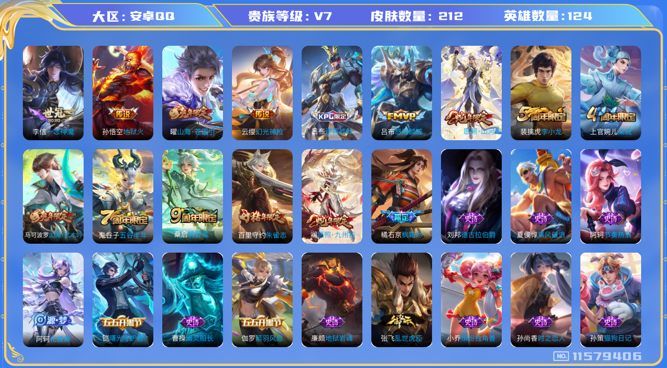 - [12030684]V7 1典藏 9传说 123英雄 237皮肤 可修改实名 优质装备:九霄神辉(木兰典藏),黄金狮子座,久胜战神,一念神魔,末日机甲-孙尚香(绿蚂蚱),地狱火 传说皮:云诺千山 珍宝阁皮:优雅恋人 限定皮:愿照·九州拓(澜年限),愿照·山河定(司空震年限),至尊宝,时雨天司(水龙头),飞衡(韩信年限),遇见飞天,梁祝,御风骁将(吕布年限),李小龙,逐梦之影,朱雀志(守约年限),大圣娶亲,冰霜恋舞曲 史诗皮:鸭鸭历险记-刘禅,飞车小橘子,化蝶舞,龙之律动,雪豹·霜爪,藏狐·褐绒,石田雨龙,茶境仙,百相守梦-黄忠,紫霞仙子,千年之狐,魅语,冰冠公主,偶像歌手,猫狗日记-大乔,修罗,女仆咖啡,水果甜心,星夜王子,功夫厨神,暗隐猎兽者,幽灵船长,鬼剑武藏,乐园奇幻夜,天秀·启明,纤云弄巧,繁星吟游(呼啦呼啦),乘风破浪,逐浪之夏,水晶猎龙者,曙光守护者,原初追逐者,圣诞狂欢,鹰眼统帅,王者之锤,魅力维加斯,黎明之约,未来纪元-赵云