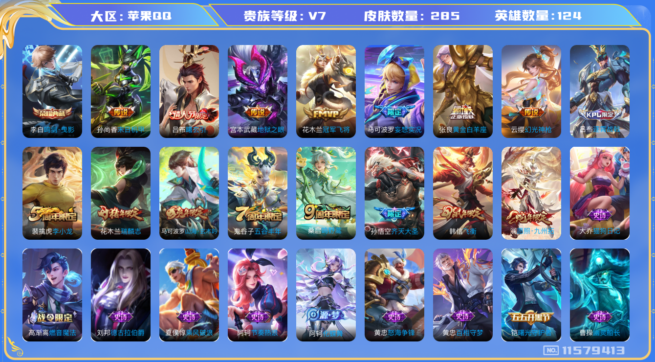 [11579413]V7 1典藏 10传说 124英雄 285皮肤 可修改实名 优质装备:鸣剑·曳影,冠军飞将,黄金白羊座,末日机甲-孙尚香(绿蚂蚱),地狱之眼,妄想实况 传说皮:吕布曦玄引,幻光神枪 珍宝阁皮:妄想食味,玩趣恶龙 限定皮:愿照·九州拓(澜年限),逐霄战戟,鸣野蒿,飞衡(韩信年限),瑞麟志(木兰年限),齐天大圣,五谷丰年,李小龙,山海·玄木吟(马可年限) 史诗皮:鸭鸭历险记-刘禅,器灵·浮梦炉,化蝶舞,星界战将,龙之律动,石田雨龙,茶境仙,怒海争锋,破空之剑,战舞者,蒙犽顽岩魄,琥珀纪元伽罗,上官婉儿群星魔术团,蔬乡物语(鲁班七号),百相守梦-百里守约,百相守梦-黄忠,织梦人,紫霞仙子,特工魅影,千年之狐,江河有灵,百解令(蒙犽),高渐离燃音魔法,蒙恬荣光圣徽,电玩·爆裂旋风,龙骑士(小龙虾),末日机甲-吕布,猫狗日记-孙策,猫狗日记-大乔,节奏热浪,女仆咖啡,摇滚巨星,水果甜心,绅士熊喵,天才门将,星夜王子,心灵骇客,功夫厨神,德古拉伯爵,暗隐猎兽者,幽灵船长,鬼剑武藏,暗渊魔法,乐园奇幻夜,天秀·启明,舞动绿茵,纤云弄巧,繁星吟游(呼啦呼啦),拒霜思,缤纷独角兽,乘风破浪,逐浪之夏,水晶猎龙者,曙光守护者,箭羽风息,金属风暴,圣诞狂欢,圣诞恋歌,鹰眼统帅,暗夜贵公子,魅力维加斯,赏金猎手,无心,未来纪元-赵云