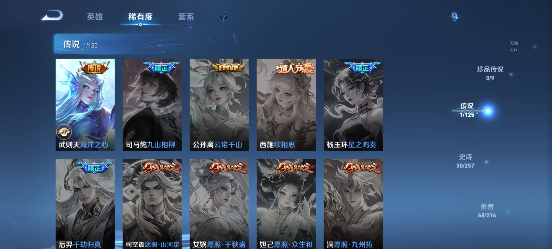 - PX_2110054-??信/绝世王者/97皮肤/123英雄/0典藏/0珍品无双/0无双/0珍品传说/3传说/22史诗/7稀有英雄 【3 传说皮肤】枫霜尽 橘右京,飞鸢探春 李元芳,山海·苍雷引 曜, 【22 史诗皮肤】紫霞仙子 露娜,百解令 蒙犽,苍穹之光 项羽,妄想食味 姬小满,德古拉伯爵 刘邦,五谷丰年 鬼谷子,顽趣 梦奇,荣光圣徽 蒙恬,逐梦之音 貂蝉,星界游侠 暃,匿光侦查者 李元芳,逐