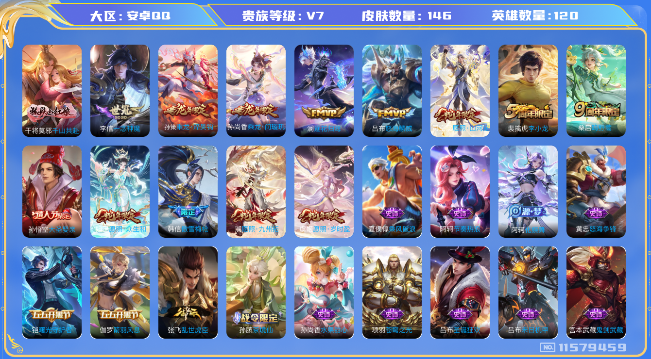 [11579459]V7 11传说 120英雄 146皮肤 可修改实名 优质装备:一念神魔,澜逐花归海,千山共赴 传说皮:乘龙·问璇玑(孙尚香年限),乘龙·淬吴钩(孙策年限) 珍宝阁皮:胡桃夹子,蔷薇恋人 限定皮:愿照·九州拓(澜年限),愿照·岁时盈(虞姬年限),愿照·山河定(司空震年限),愿照·众生和(妲己年限),鸣野蒿,傲雪梅枪,怒海麟威,李小龙,大圣娶亲 史诗皮:化蝶舞,龙之律动,茶境仙,怒海争锋,破空之剑,超元猎域,百相守梦-百里守约,苍穹之光,白龙吟,特工魅影,偶像歌手,晚萤,末日机甲-吕布,乱世虎臣,节奏热浪,摇滚巨星,水果甜心,暗隐猎兽者,鬼剑武藏,心灵战警,纤云弄巧,乘风破浪,逐浪之夏,曙光守护者,箭羽风息,圣诞狂欢,圣诞恋歌,鹰眼统帅,魅力维加斯,赏金猎手,未来纪元-赵云