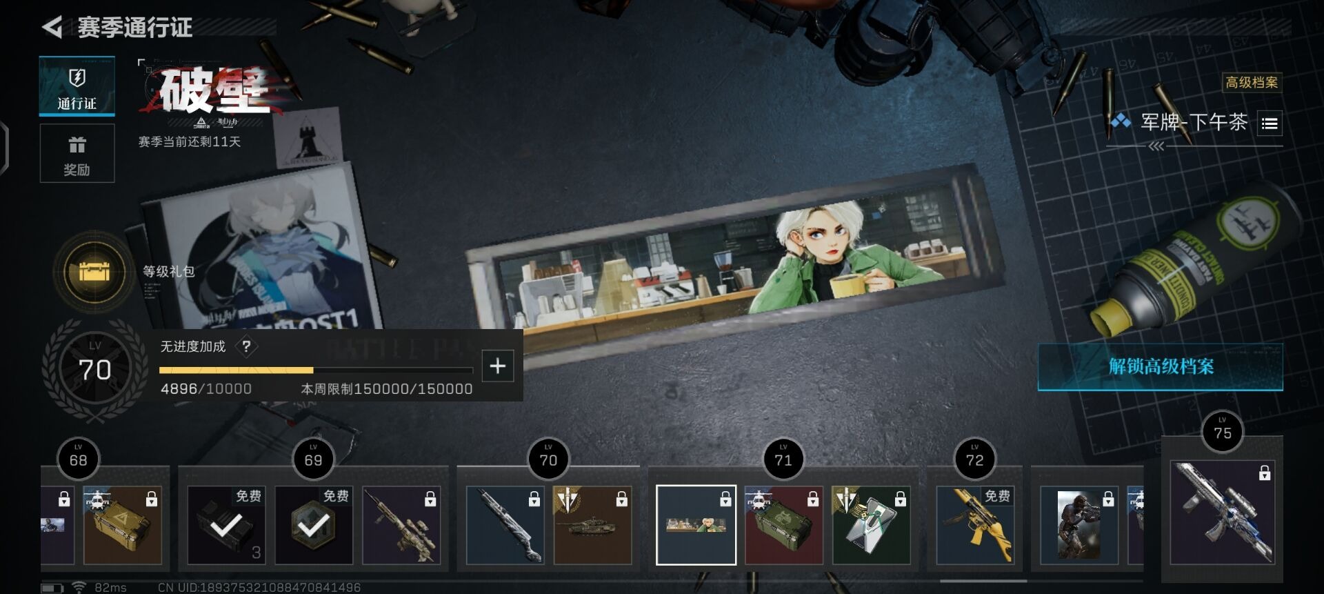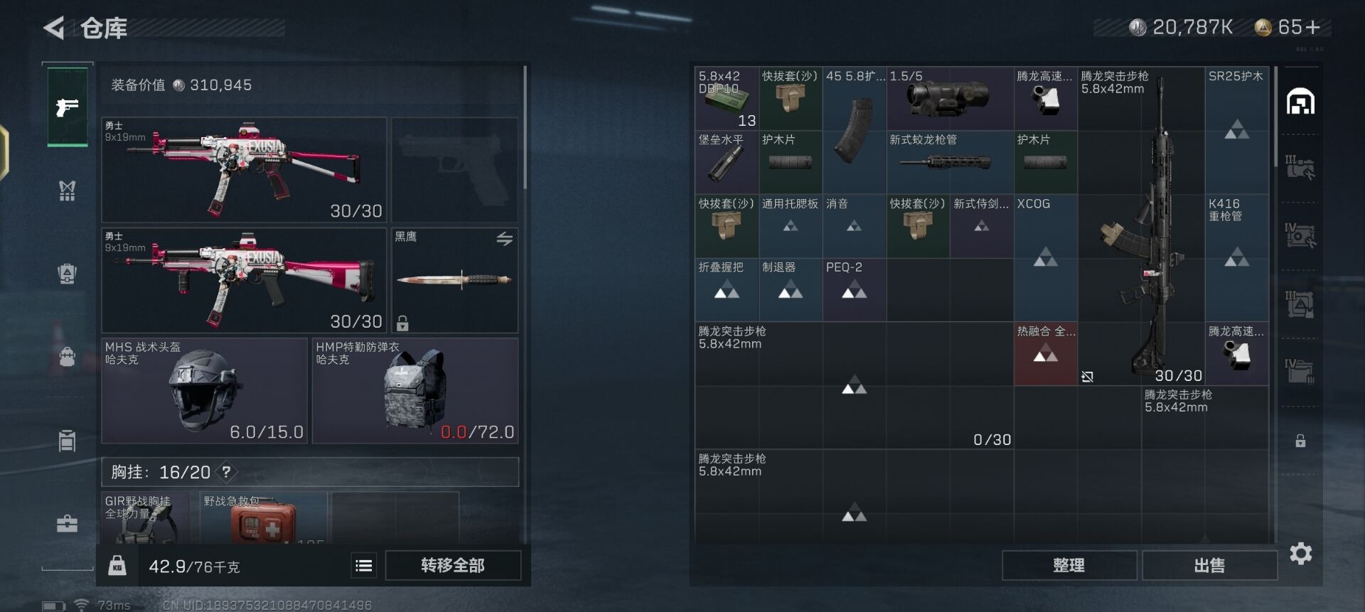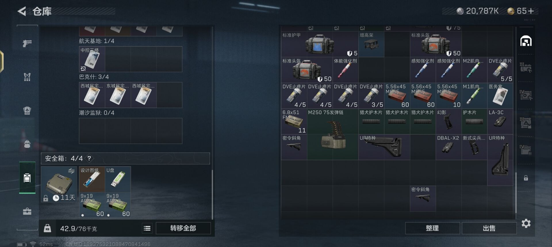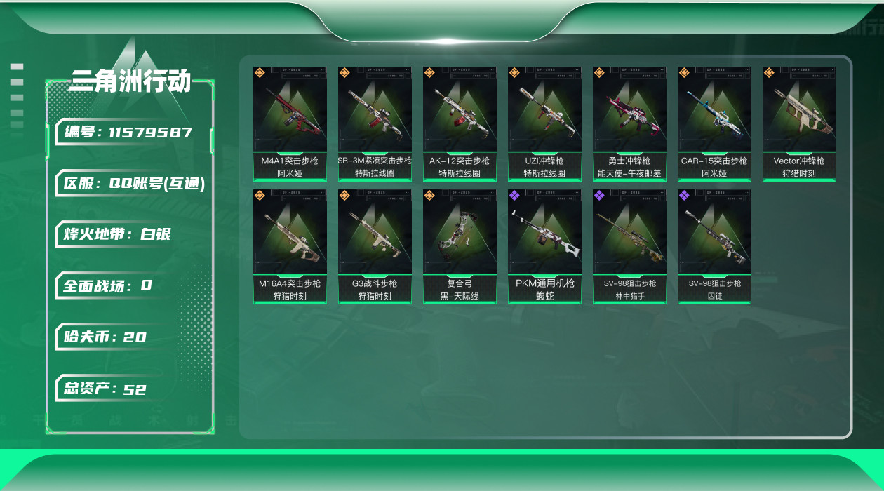 [11579587]总资产:52.7M 10传说枪械 哈夫币:20.787K 进阶安全箱(9.17到期) 可二次 可修改实名 烽火地带段位:白银 全面战场段位:军士长 传说武器皮肤:UZI冲锋枪-特斯拉线圈,M16A4突击步枪-狩猎时刻,AK-12突击步枪-特斯拉线圈,SR-3M紧凑突击步枪-特斯拉线圈,勇士冲锋枪-能天使-午夜邮差,Vector冲锋枪-狩猎时刻,G3战斗步枪-狩猎时刻,复合弓-黑-天际线,M4A1突击步枪-阿米娅,CAR-15突击步枪-阿米娅 史诗武器皮肤:PKM通用机枪-蝮蛇,SV-98狙击步枪-林中猎手,SV-98狙击步枪-囚徒