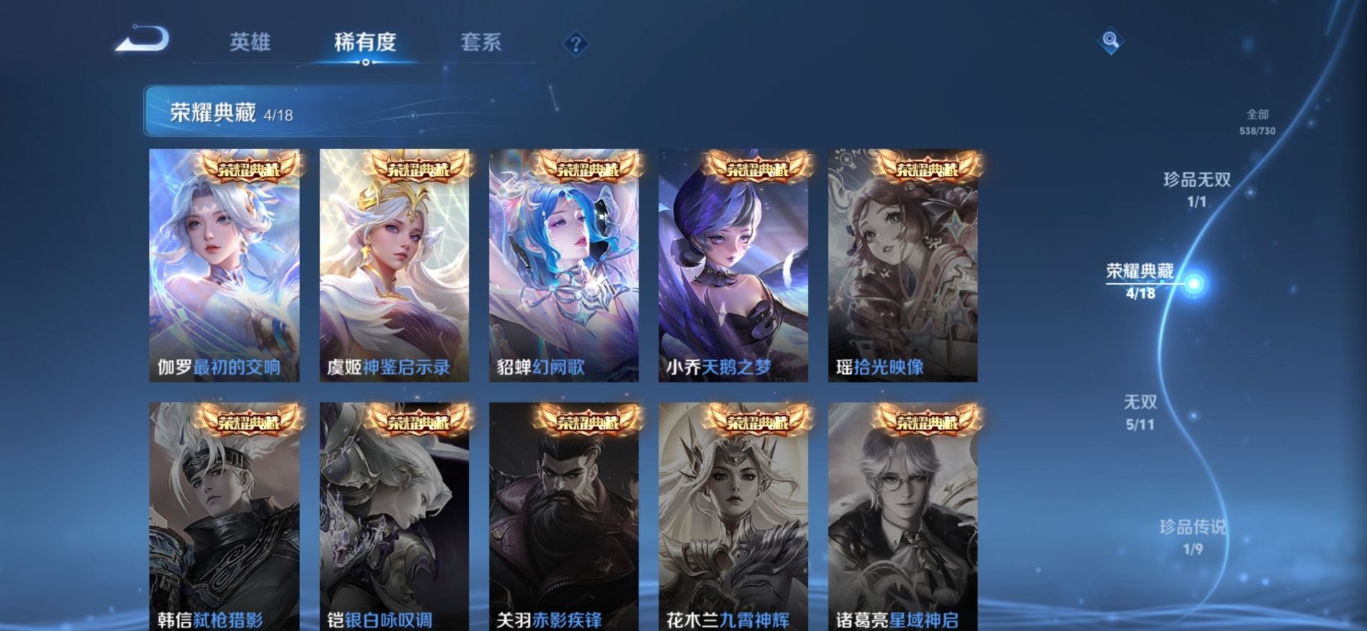 夏侯惇朔风刀,曹操烛龙,苏烈千军破阵,牛魔御旌,项羽苍威无极,镜青焰无极,庄周蜃楼王,裴擒虎擒涛扼浪,蒙犽狂想玩偶喵,马可波罗暗影游猎,鬼谷子原初探秘者,张良古海寻踪,芈月重明,扁鹊炼金王,虞姬凯尔特女王,刘邦夺宝奇兵,沈梦溪星空之诺,沈梦溪大漠名商,孙膑妖精王,典韦穷奇,典韦蓝屏警告,达摩沙漠行僧,鲁班七号狮舞东方,吕布猎兽之王,元歌云间偶戏,兰陵王金庭之子,鲁班大师探海日志,明世隐疑决卦,白起狰,亚瑟狮心王,女娲朔望之晖,桑启海盐诗旅,狄仁杰万华元夜,程咬金演武夺筹,李元芳银河之约,李元芳云中旅人,弈星混沌棋,钟馗神迹守卫,钟馗驱傩正仪,太乙真人饕餮