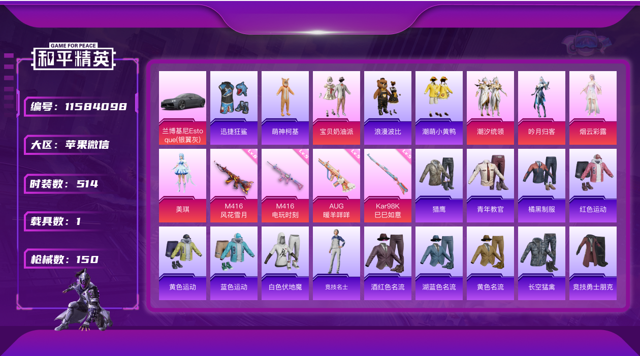 [11584098]5粉装 4特效枪 1载具 9印记 可二次 可修改实名 永久社交场景限制 身法装备:8号机(新粉螳螂) 优质装备:兰博基尼Estoque(银翼灰),宝贝奶油派,潮汐统领,M416风花雪月,M416电玩时刻,AUG-暖羊咩咩,Kar98K-巳巳如意 热门装扮:吟月归客,烟云彩露,美琪,萌神柯基,潮萌小黄鸭,迅捷狂鲨,浪漫波比 六级特效枪:六级M416-风花雪月 五级特效枪:五级Kar98K-巳巳如意,五级AUG-暖羊咩咩,五级M416-电玩时刻 紫色装扮:田园牧歌,轻风白浪,SS22特训,SS23特训,幻彩翩翩,妙红点点,娇憨猪猪,萌趣咩咩,暖心熊熊,SS21特训,熠彩粉晶,SS31特训套装,SS5特训,人气偶像,冰川特警,北国孤狼,霓虹热舞,SS30特训套装,云朵鹅,雪绒豹,SS33特训套装,顶瓜瓜,SS20特训,爆裂葡萄,骁骑迪迦,治愈之星,科技之星,SS14特训,SS19特训,瑞龙福将,团圆交子,SS17特训,异彩先驱,SS18特训,都市魅力,酒红色名流,长空猛禽,雪山精英,霓虹极客,霓虹街区,青年教官,迎春赐吉,风暴特警,荷畔雨呱,缤纷果语,耀动青春,蓝色守护者,蓝色运动,西部风情,跃动心情,龙腾端午,魅力单车,黄色名流,黄色运动,龟仙人,香桃花海,橘黑制服,海岛探路者,深蓝色名流,圣诞大吉,夏日倾情,完美偶像,帅气教官,幻世战舞者,怒火燎原,战地菁英,湖蓝色名流,绮丽涂鸦,疯狂小兔子,白色伏地魔,破蛋小黄鸡,空投萌叽,竞技勇士朋克,竞技达人朋克,红色运动,甜蜜熊情侣,灼焰舞者,燃烧卡路里,牛气满满,特战装甲,特殊使命,特训学院,猎鹰,SS29特训,星途旅人,白光莹,纯真浪花,热情海星,曼妙人鱼,SS28特训,迎夏光舞,听雨铃兰,奶油梦幻熊,8号机(新粉螳螂),冰公主,异域银装,石蕴玉辉,鱼渊荷华,燕燕于飞,巳巳如意,竞技名士,街头风暴,小狗蛇点点,SS24特训(SS24特训套装),SS27特训,萌趣绒叽,精神漫游,炽焰拳师,格斗专家,SS6特训,核芯基因,SS7特训,摇滚狂鲨,深蓝冒险家,迷域探索者,拳皇97草薙京,顽皮玉兔,花式比心,折纸暴龙,云纹魔法士,SS8特训,玄武圣者,大橘大利,SS12特训,纯白誓言,SS9特训,暗夜契约,SS11特训,耀粉歌者,SS32特训服(SS32特训套装),青玉碎影,白糯汤圆,恋语绒绒,冷酷挑战者,丛林猎人,传奇侦探