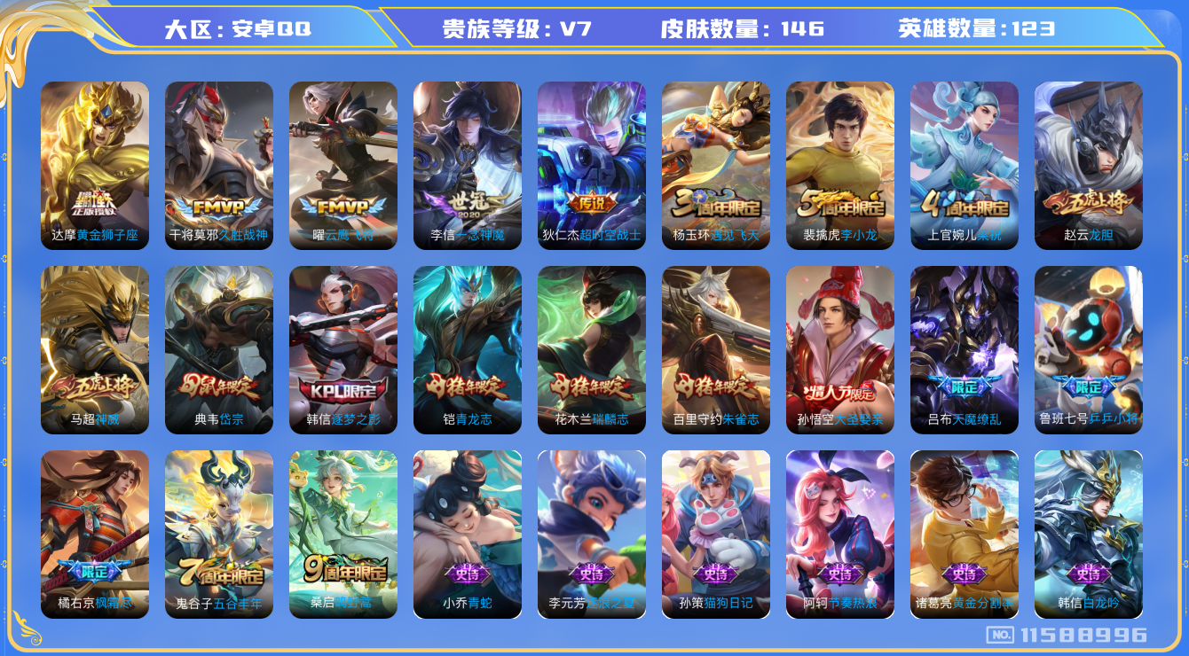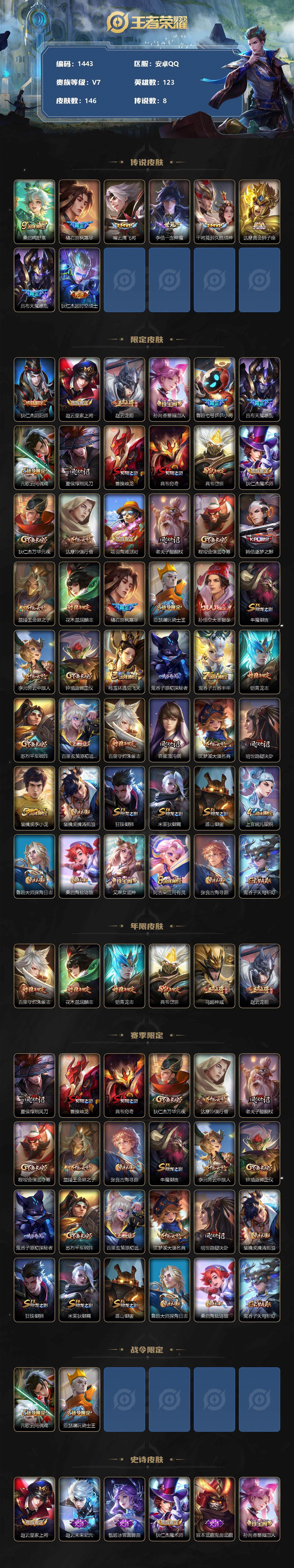 [11588996]【商品标题】:安卓Q-V5-最强王者段位-123英雄-146皮肤-0典藏-0珍品无双-0无双-0珍品传说-8传说-47史诗
