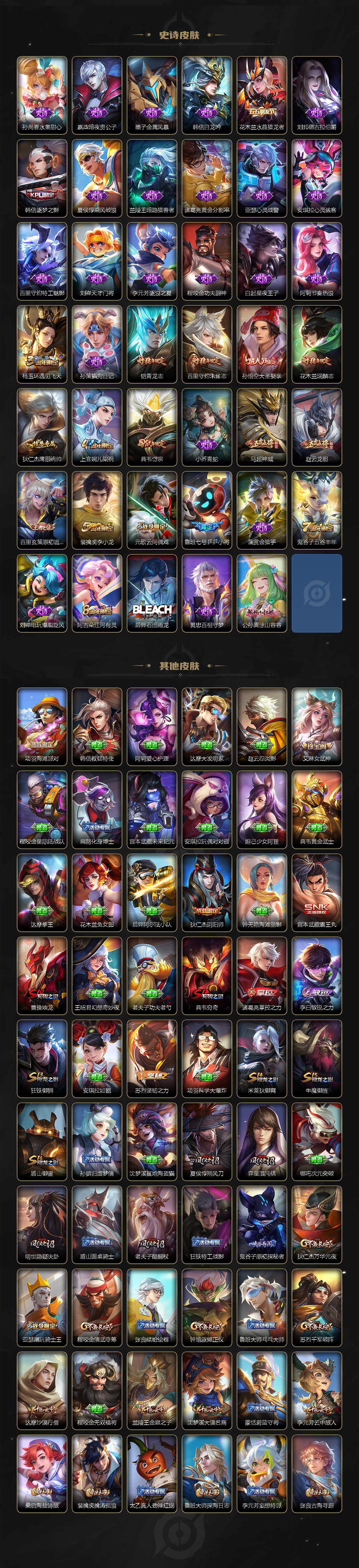 【史诗皮肤】:赵云皇家上将,赵云未来纪元,甄姬冰雪圆舞曲,狄仁杰魔术师,宫本武藏鬼剑武藏,孙尚香蔷薇恋人,孙尚香水果甜心,嬴政暗夜贵公子,墨子金属风暴,韩信白龙吟,花木兰水晶猎龙者,刘邦德古拉伯爵,韩信逐梦之影,夏侯惇乘风破浪,兰陵王暗隐猎兽者,诸葛亮黄金分割率,亚瑟心灵战警,安琪拉心灵骇客,百里守约特工魅影,刘禅天才门将,李元芳逐浪之夏,程咬金功夫厨神,白起星夜王子,阿轲节奏热浪,杨玉环遇见飞天,孙策猫狗日记,铠青龙志,百里守约朱雀志,孙悟空大圣娶亲,花木兰瑞麟志,狄仁杰鹰眼统帅,上官婉儿梁祝,典韦岱宗,小乔青蛇,马超神威,赵云龙胆,百里玄策原
