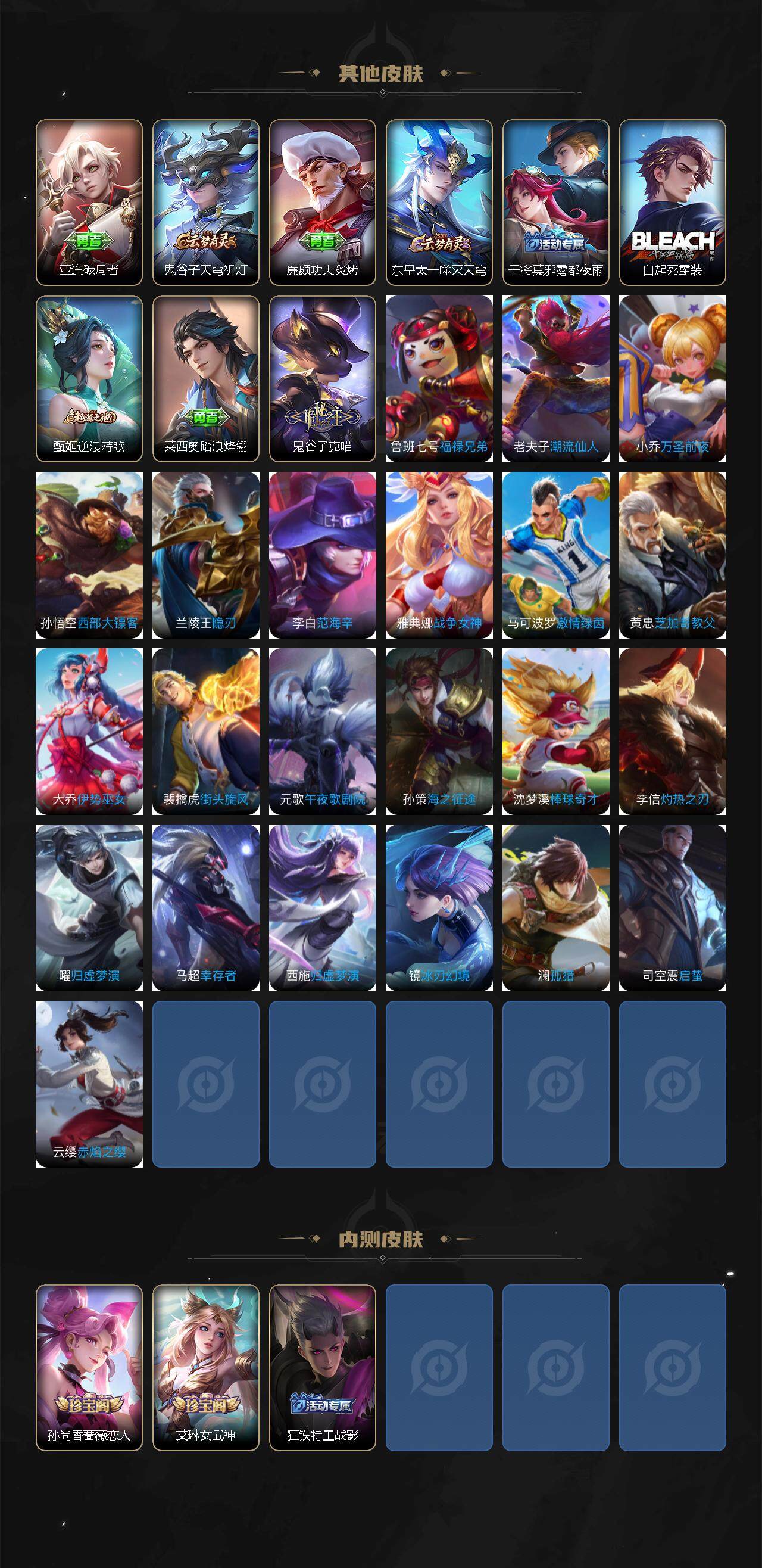【赛季限定】:夏侯惇朔风刀,曹操烛龙,典韦穷奇,狄仁杰万华元夜,达摩沙漠行僧,老夫子醍醐杖,程咬金演武夺筹,兰陵王金庭之子,张良古海寻踪,牛魔御旌,李元芳云中旅人,钟馗驱傩正仪,鬼谷子原初探秘者,苏烈千军破阵,百里玄策原初追逐者,弈星混沌棋,沈梦溪大漠名商,明世隐疑决卦,裴擒虎擒涛扼浪,狂铁御狮,米莱狄御霄,盾山御銮,鲁班大师探海日志,桑启海盐诗旅,鬼谷子天穹祈灯