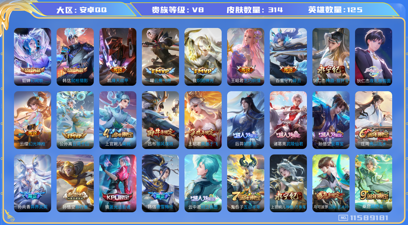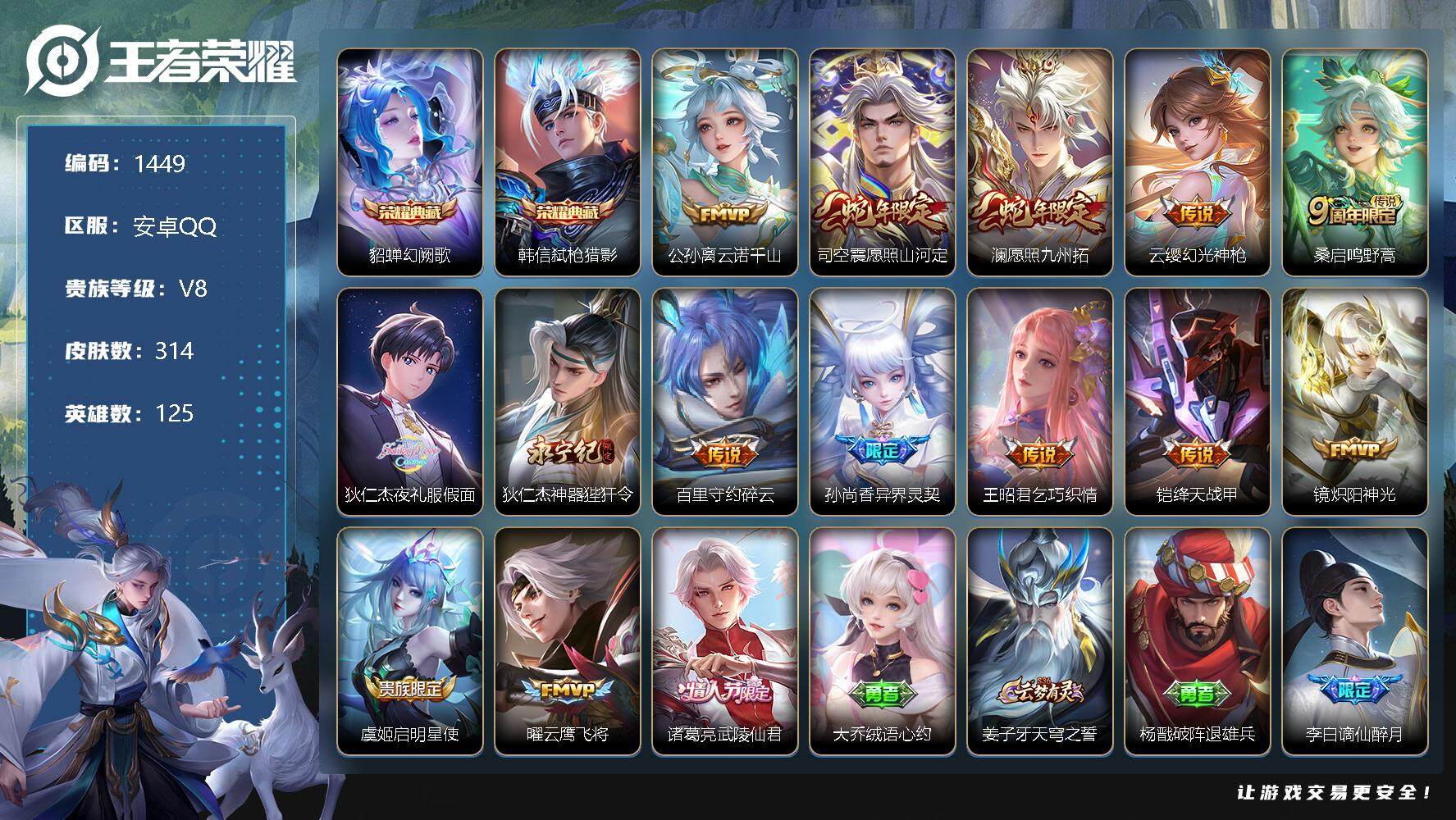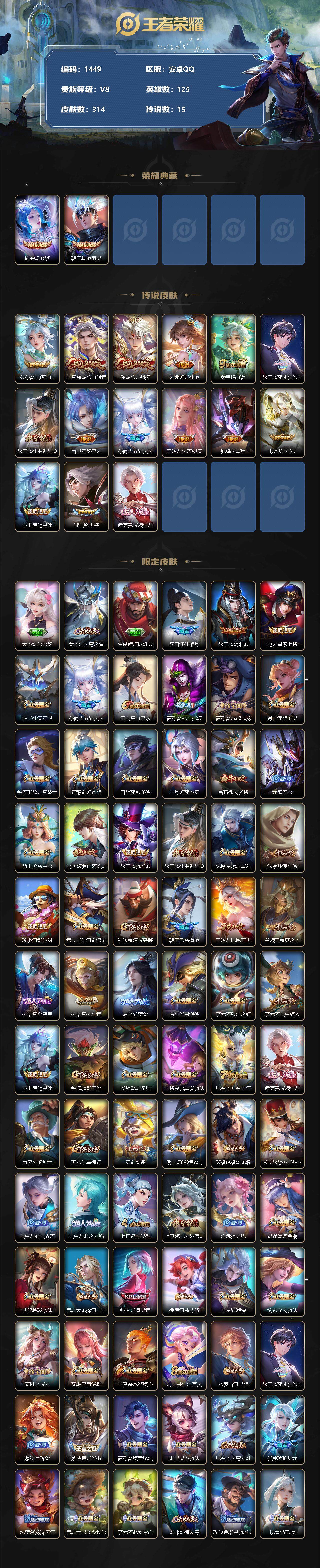 [11589181]【商品标题】:安卓Q-V7-最强王者段位-125英雄-314皮肤-2典藏-0珍品无双-0无双-0珍品传说-15传说-99史诗