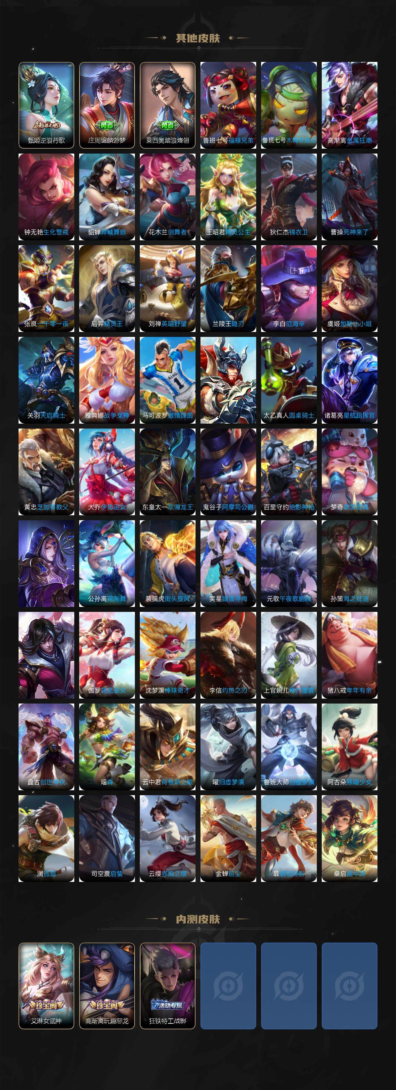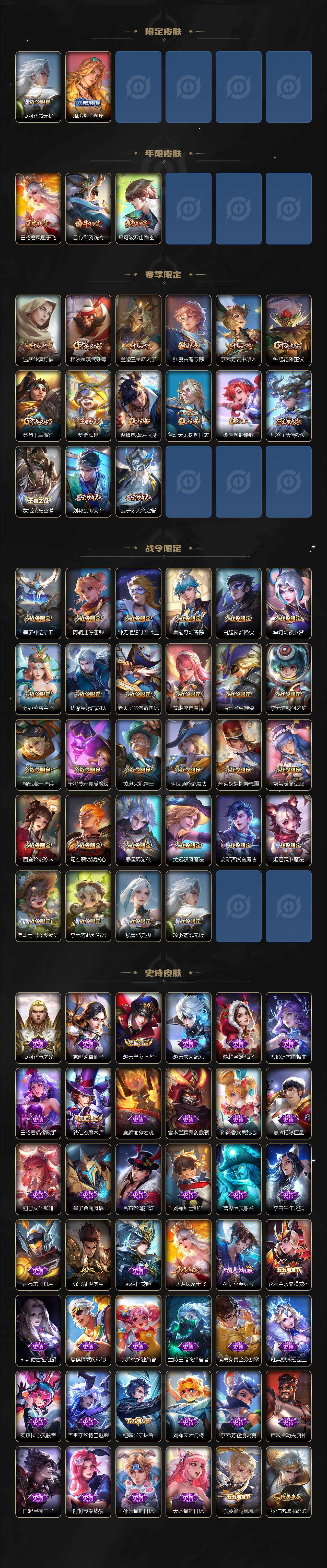 【限定皮肤】:大乔绒语心约,姜子牙天穹之誓,杨戬破阵退雄兵,李白谪仙醉月,狄仁杰阴阳师,赵云皇家上将,墨子神迹守卫,孙尚香异界灵契,庄周高山流水,高渐离死亡摇滚,高渐离玩趣恶龙,阿轲迷踪丽影,钟无艳超时空战士,扁鹊奇幻香踪,白起夜都怪侠,芈月幻夜卜梦,吕布御风骁将,元歌无心,甄姬落雪兰心,马可波罗山海玄木吟,狄仁杰魔术师,狄仁杰神器狴犴令,达摩星际陆战队,达摩沙漠行僧,项羽海滩派对,老夫子航海奇遇记,程咬金演武夺筹,韩信傲雪梅枪,王昭君凤凰于飞,兰陵王金庭之子,孙悟空至尊宝,孙悟空孙行者,后羿如梦令,后羿圣弓游侠,李元芳银河之约,李元芳云中旅人,虞姬启明星使,钟馗驱傩正仪,杨戬潮玩骑兵,干将莫邪真爱魔法,鬼谷子五谷丰年,诸葛亮武陵仙君,黄忠火炮绅士,苏烈千军破阵,梦奇顽趣,明世隐吟游魔法,裴擒虎擒涛扼浪,米莱狄胡桃异想国,云中君纤云弄巧,云中君时之祈愿,上官婉儿梁祝,上官婉儿神器万象笔,嫦娥拒霜思,嫦娥暖冬兔眠,西施玲珑珍味,鲁班大师探海日志,镜匿光追影者,桑启海盐诗旅,暃星界游侠,戈娅驭风魔法,艾琳女武神,艾琳流音漫舞,司空震地狱燃心,阿古朵江河有灵,张良古海寻踪,狄仁杰夜礼服假面,蒙犽百解令,蒙恬荣光圣徽,高渐离燃音魔法,妲己灵卜魔法,鬼谷子天穹祈灯,伽罗琥珀纪元,沈梦溪龙舞盛年,鲁班七号蔬乡物语,李元芳蔬乡物语,刘邦剑破天穹,程咬金群星魔术团,镜青焰无极,项羽苍威无极,周瑜熔金海岸