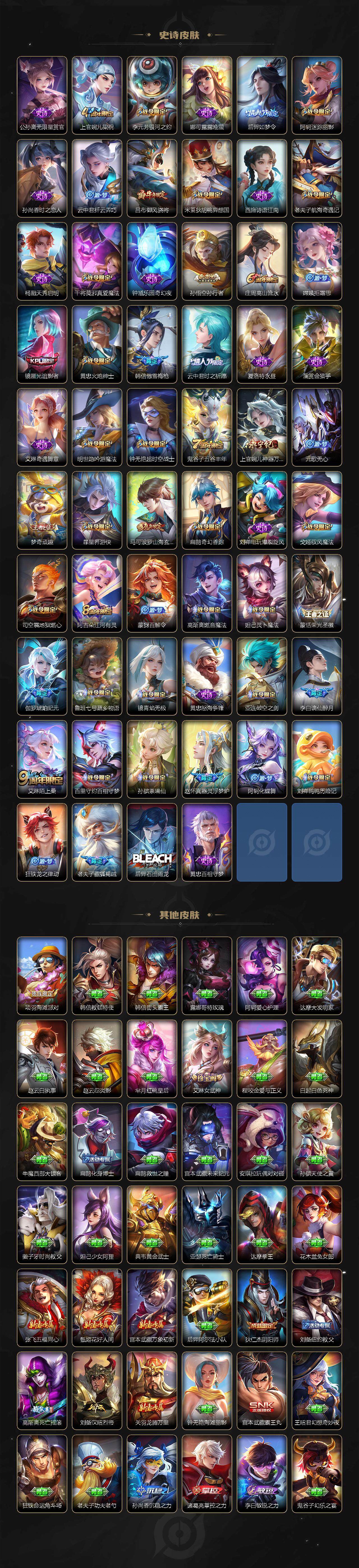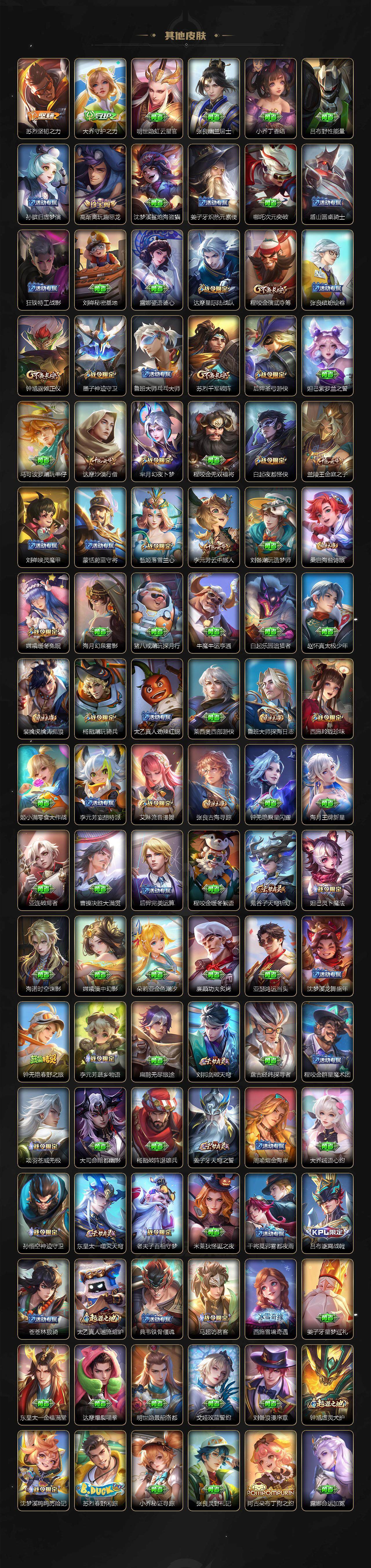娜可露露晚萤,伽罗箭羽风息,李元芳逐浪之夏,公孙离无限星赏官,大乔猫狗日记,孙策猫狗日记,阿轲节奏热浪,露娜紫霞仙子,诸葛亮黄金分割率,王昭君偶像歌手,韩信白龙吟,项羽苍穹之光,孙尚香时之恋人,雅典娜冰冠公主,吕布末日机甲,嬴政摇滚巨星,刘禅绅士熊喵,刘禅天才门将,白起星夜王子,安琪拉心灵骇客,程咬金功夫厨神,刘邦德古拉伯爵,兰陵王暗隐猎兽者,曹操幽灵船长,宫本武藏鬼剑武藏,钟馗乐园奇幻夜,杨戬天秀·启明,廉颇地狱岩魂,西施诗语江南,小乔缤纷独角兽,夏侯惇乘风破浪,花木兰水晶猎龙者,铠曙光守护者,墨子金属风暴,吕布圣诞狂欢,貂蝉圣诞恋歌,百里守约特工魅影,嫦娥拒霜思,李白千年之狐,夏洛特永昼,澜赏金猎手,艾琳奇遇舞章,刘禅电玩·爆裂旋风,蒙犽百解令,高渐离燃音魔法,伽罗琥珀纪元,李白谪仙醉月,赵怀真器灵·浮梦炉