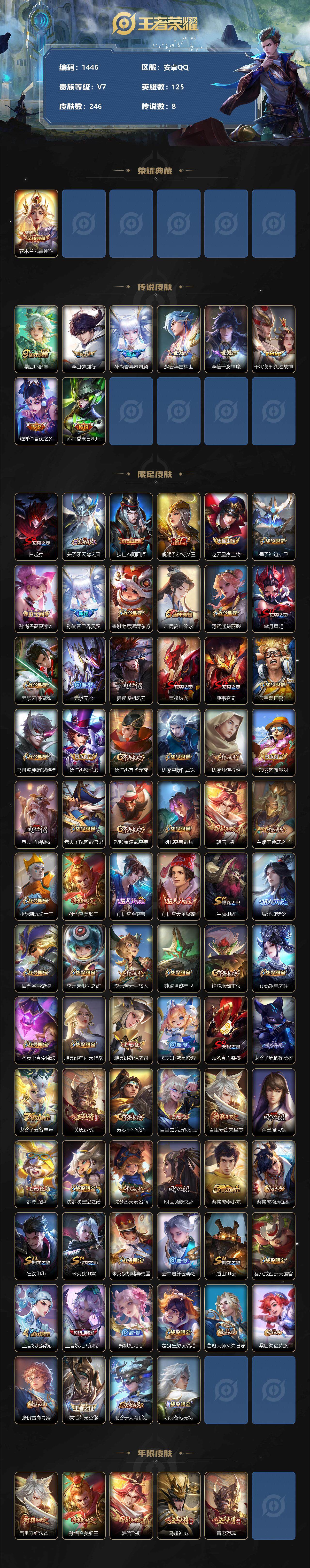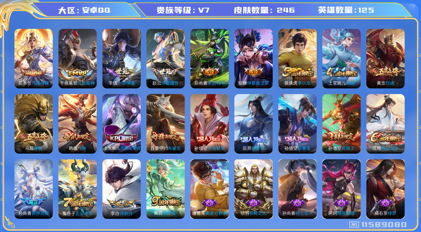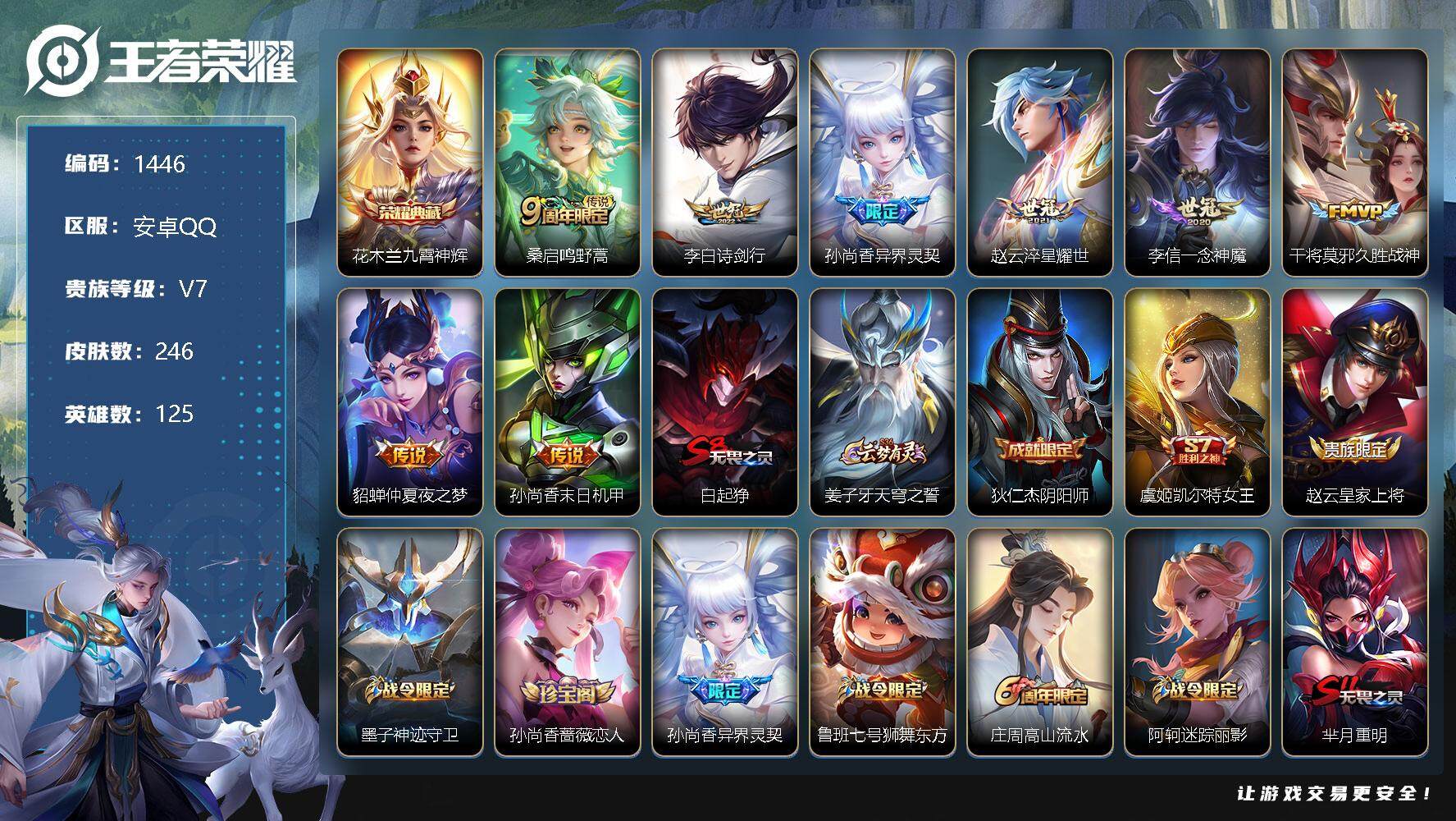 [11589080]【商品标题】:安卓Q-V7-最强王者段位-125英雄-246皮肤-1典藏-0珍品无双-0无双-0珍品传说-8传说-56史诗