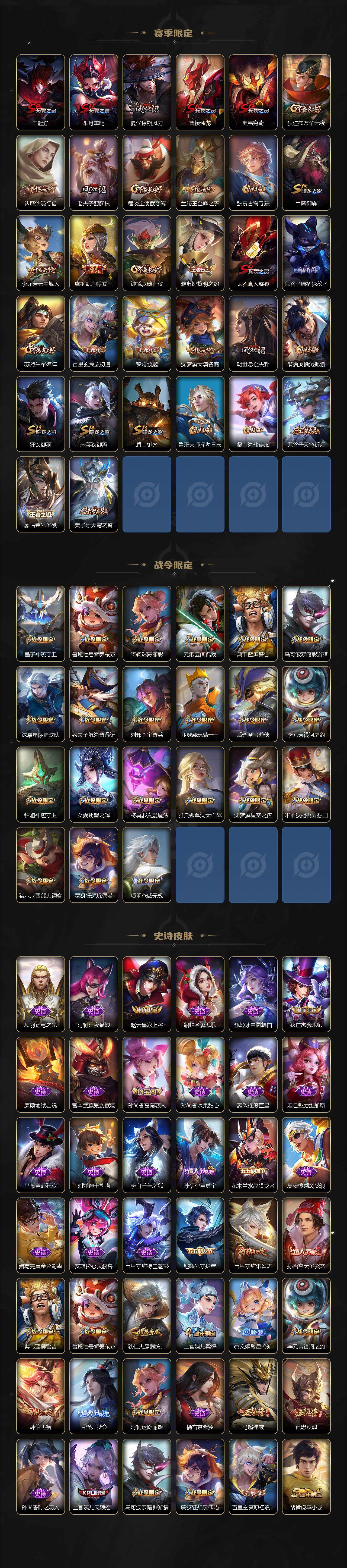 虞姬凯尔特女王,白起狰,太乙真人饕餮,曹操烛龙,芈月重明,典韦穷奇,狂铁御狮,米莱狄御霄,牛魔御旌,盾山御銮,夏侯惇朔风刀,明世隐疑决卦,老夫子醍醐杖,鬼谷子原初探秘者,狄仁杰万华元夜,程咬金演武夺筹,钟馗驱傩正仪,苏烈千军破阵,女娲朔望之晖,典韦蓝屏警告,钟馗神迹守卫,鲁班七号狮舞东方,沈梦溪星空之诺,李元芳银河之约,刘邦夺宝奇兵,马可波罗暗影游猎,蒙犽狂想玩偶喵,元歌云间偶戏,弈星混沌棋,达摩沙漠行僧,兰陵王金庭之子,沈梦溪大漠名商,李元芳云中旅人,桑启海盐诗旅,裴擒虎擒涛扼浪,鲁班大师探海日志,张良古海寻踪,项羽苍威无极