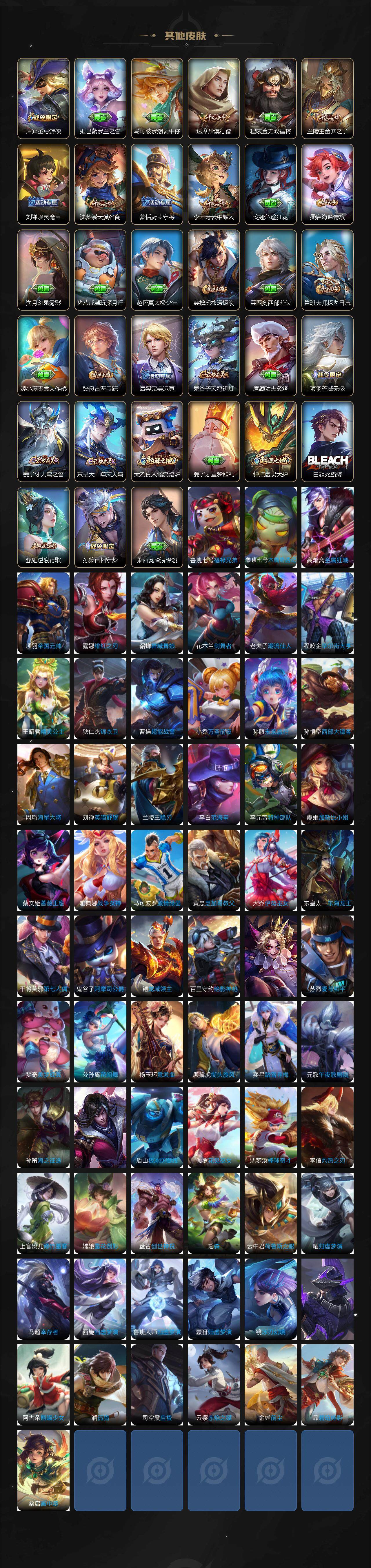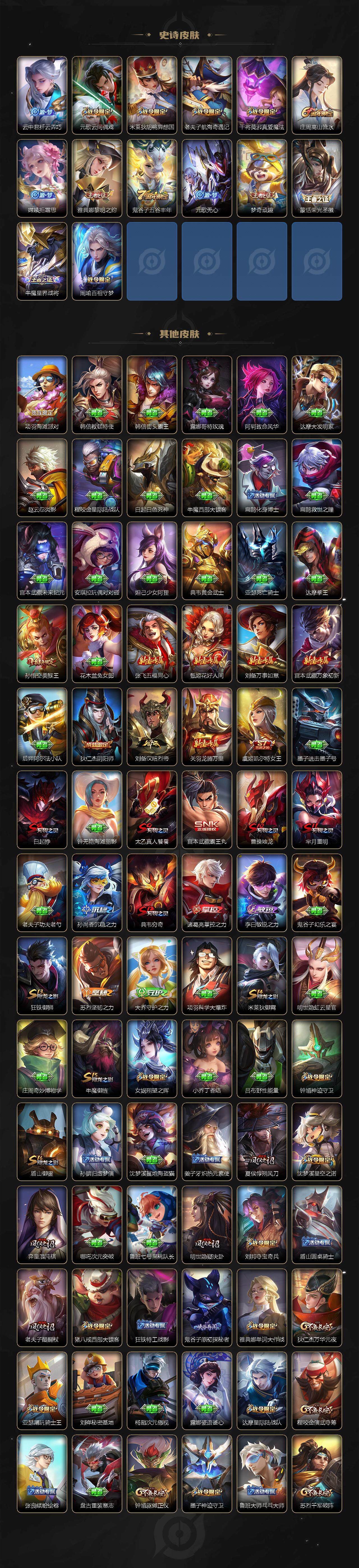 【限定皮肤】:白起狰,姜子牙天穹之誓,狄仁杰阴阳师,虞姬凯尔特女王,赵云皇家上将,墨子神迹守卫,孙尚香蔷薇恋人,孙尚香异界灵契,鲁班七号狮舞东方,庄周高山流水,阿轲迷踪丽影,芈月重明,元歌云间偶戏,元歌无心,夏侯惇朔风刀,曹操烛龙,典韦穷奇,典韦蓝屏警告,马可波罗暗影游猎,狄仁杰魔术师,狄仁杰万华元夜,达摩星际陆战队,达摩沙漠行僧,项羽海滩派对,老夫子醍醐杖,老夫子航海奇遇记,程咬金演武夺筹,刘邦夺宝奇兵,韩信飞衡,兰陵王金庭之子,亚瑟潮玩骑士王,孙悟空美猴王,孙悟空至尊宝,孙悟空大圣娶亲,牛魔御旌,后羿如梦令,后羿圣弓游侠,李元芳银河之约,李元芳云中旅人,钟馗神迹守卫,钟馗驱傩正仪,女娲朔望之晖,干将莫邪真爱魔法,雅典娜单词大作战,雅典娜黎明之约,蔡文姬繁星吟游,太乙真人饕餮,鬼谷子原初探秘者,鬼谷子五谷丰年,黄忠烈魂,苏烈千军破阵,百里玄策原初追逐者,百里守约朱雀志,弈星混沌棋,梦奇顽趣,沈梦溪星空之诺,沈梦溪大漠名商,明世隐疑决卦,裴擒虎李小龙,裴擒虎擒涛扼浪,狂铁御狮,米莱狄御霄,米莱狄胡桃异想国,云中君纤云弄巧,盾山御銮,猪八戒西部大镖客,上官婉儿梁祝,上官婉儿天狼绘梦者,嫦娥拒霜思,蒙犽狂想玩偶喵,鲁班大师探海日志,桑启海盐诗旅,张良古海寻踪,蒙恬荣光圣徽,鬼谷子天穹祈灯,项羽苍威无极