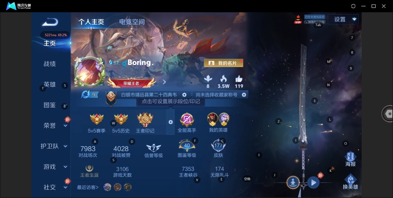 - [11657721]V8 2典藏 21传说 123英雄 343皮肤 可修改实名 连体和平 优质装备:鸣剑·曳影,九霄神辉(木兰典藏),黄金射手座,云鹰飞将(小将军),久胜战神,炽阳神光,一念神魔,末日机甲-孙尚香(绿蚂蚱),地狱火,仲夏夜之梦(大飞蛾),地狱之眼,淬星耀世,超时空战士-狄仁杰,碎云,神器·狴犴令,浮生妄 传说皮:幻光神枪 珍宝阁皮:优雅恋人,女武神 限定皮:凤求凰(白切鸡),傲雪梅枪,星穹之声,绯月行,神威(电光马子),飞衡(韩信年限),山海·碧波行(瑶年限),遇见飞天,高山流水,五谷丰年,冰锋战神,游园惊梦,梁祝,天狼狩猎者,逐梦之翼,天狼溯光者,李小龙,逐梦之影,朱雀志(守约年限),霸王别姬-虞姬,默契交锋-花木兰,孙行者,大圣娶亲,青春决赛季,蜜橘之夏,匿光追影者,深海之息(深海大菠萝),枫霜尽,匿光启智者,时之奇旅-妲己,梦圆繁星 史诗皮:遇见神鹿,紫霞仙子,苍穹之光,白龙吟,黄金分割率,特工魅影,千年之狐,魅语,无限星赏官,匿光破解者,冰冠公主,偶像歌手,龙骑士(小龙虾),末日机甲-吕布,猫狗日记-孙策,猫狗日记-大乔,乱世虎臣,节奏热浪,修罗,女仆咖啡,摇滚巨星,水果甜心,绅士熊喵,天才门将,星夜王子,心灵骇客,时之奇旅-安琪拉,功夫厨神,德古拉伯爵,暗隐猎兽者,幽灵船长,鬼剑武藏,心灵战警,天秀·启明,舞动绿茵,地狱岩魂,纤云弄巧,繁星吟游(呼啦呼啦),拒霜思,缤纷独角兽,乘风破浪,逐浪之夏,水晶猎龙者,曙光守护者,箭羽风息,金属风暴,原初追逐者,圣诞狂欢,圣诞恋歌,鹰眼统帅,暗夜贵公子,魅力维加斯,黎明之约,赏金猎手,无心,未来纪元-赵云