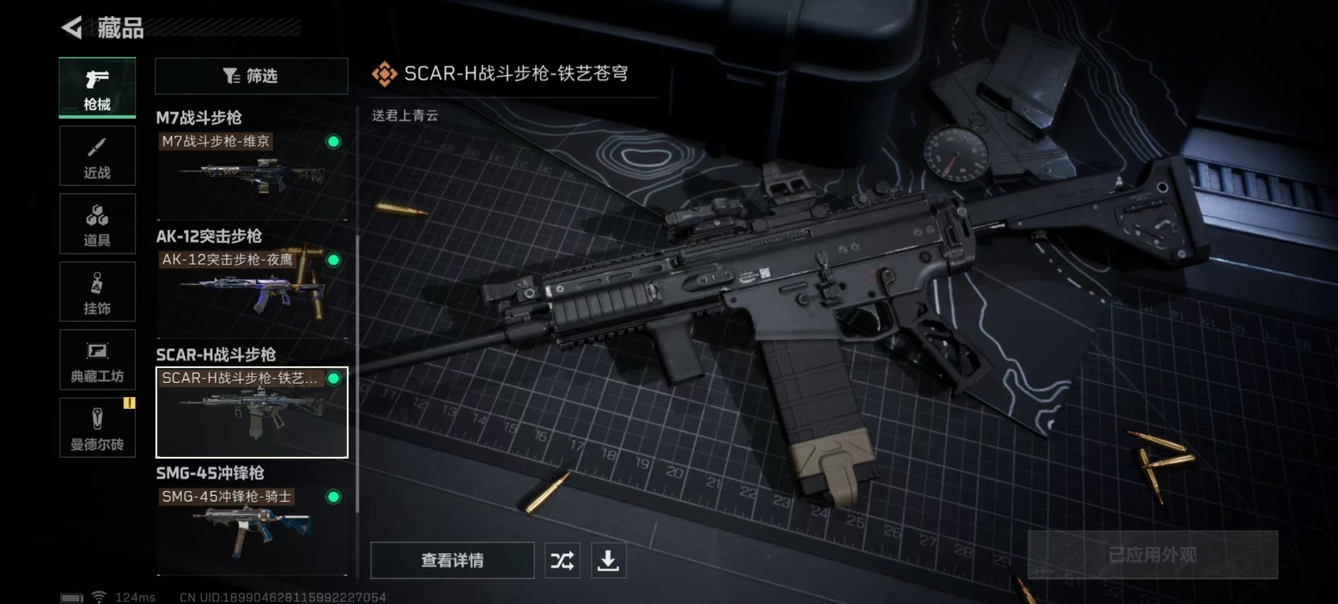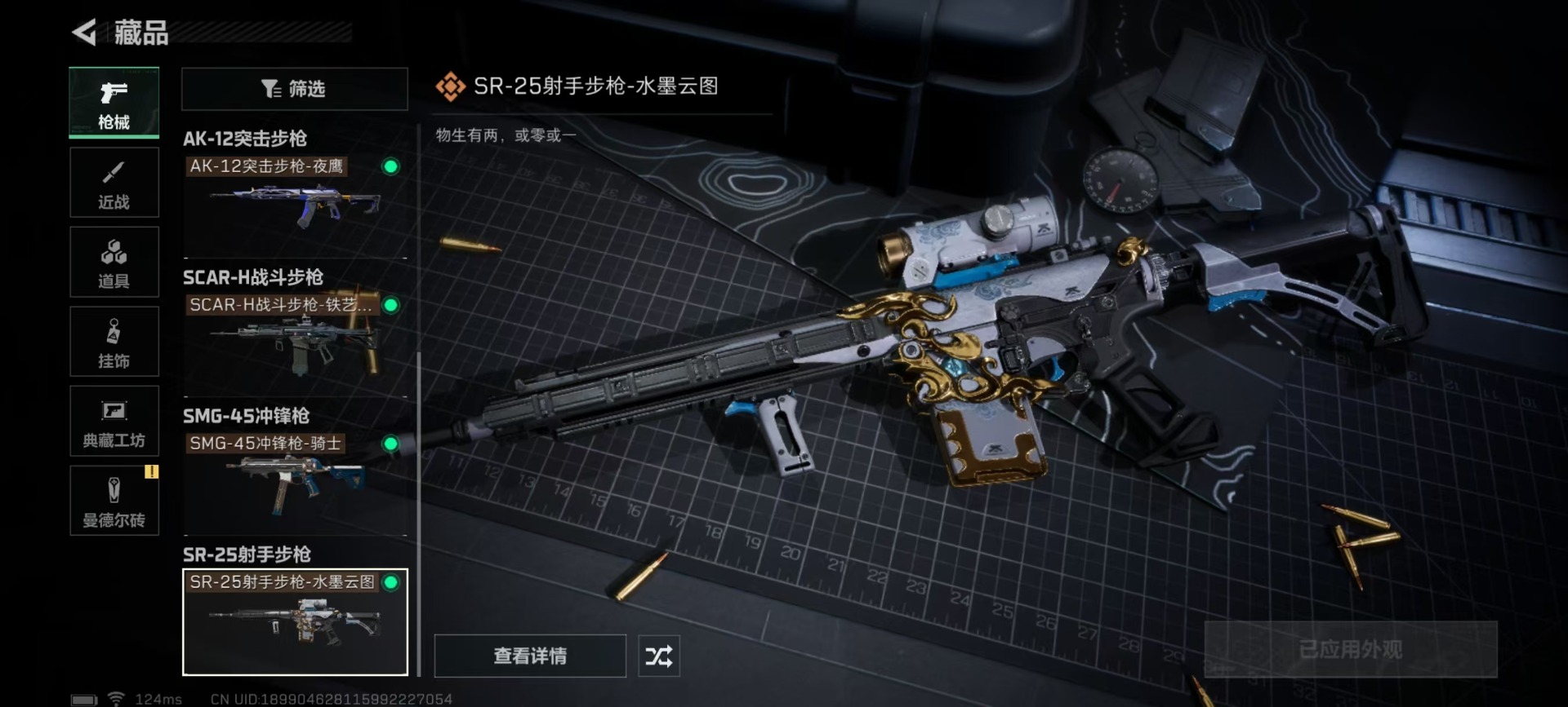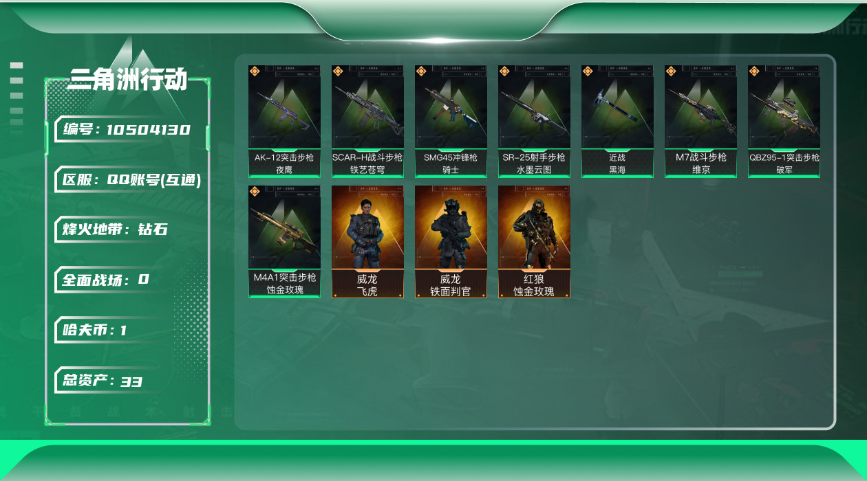 [10504130]总资产:33.6M 3干员外观 1近战传说 8传说枪械 哈夫币:1.407K 可二次 可修改实名 优质装备:近战-黑海 烽火地带段位:钻石 全面战场段位:无段位 传说武器皮肤:SR-25射手步枪-水墨云图,SCAR-H战斗步枪-铁艺苍穹,SMG45冲锋枪-骑士,AK-12突击步枪-夜鹰,M7战斗步枪-维京,M4A1突击步枪-蚀金玫瑰,QBZ95-1突击步枪-破军 干员外观:威龙-铁面判官,红狼-蚀金玫瑰,威龙-飞虎1