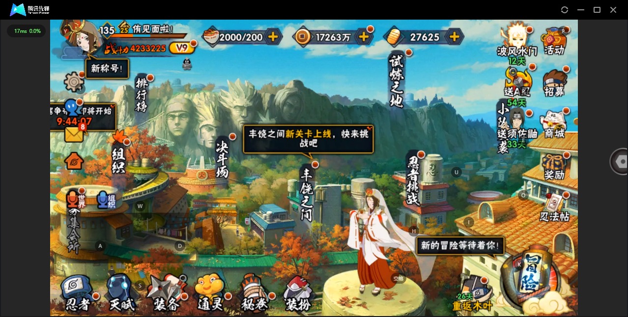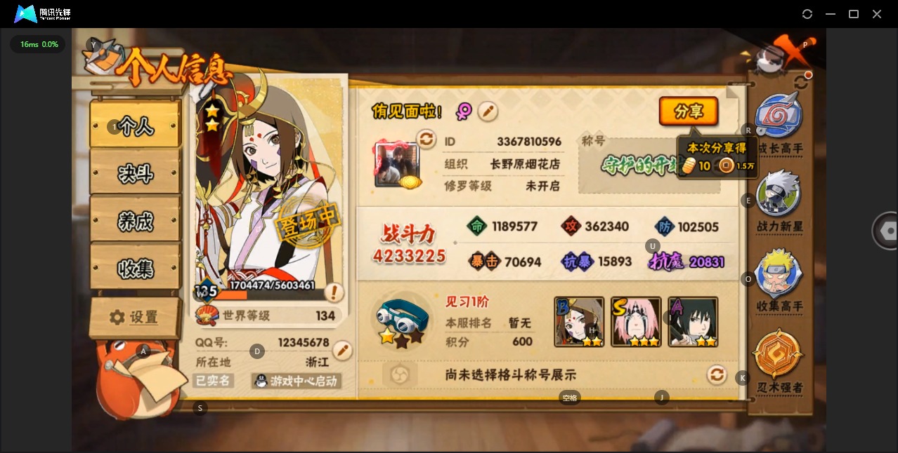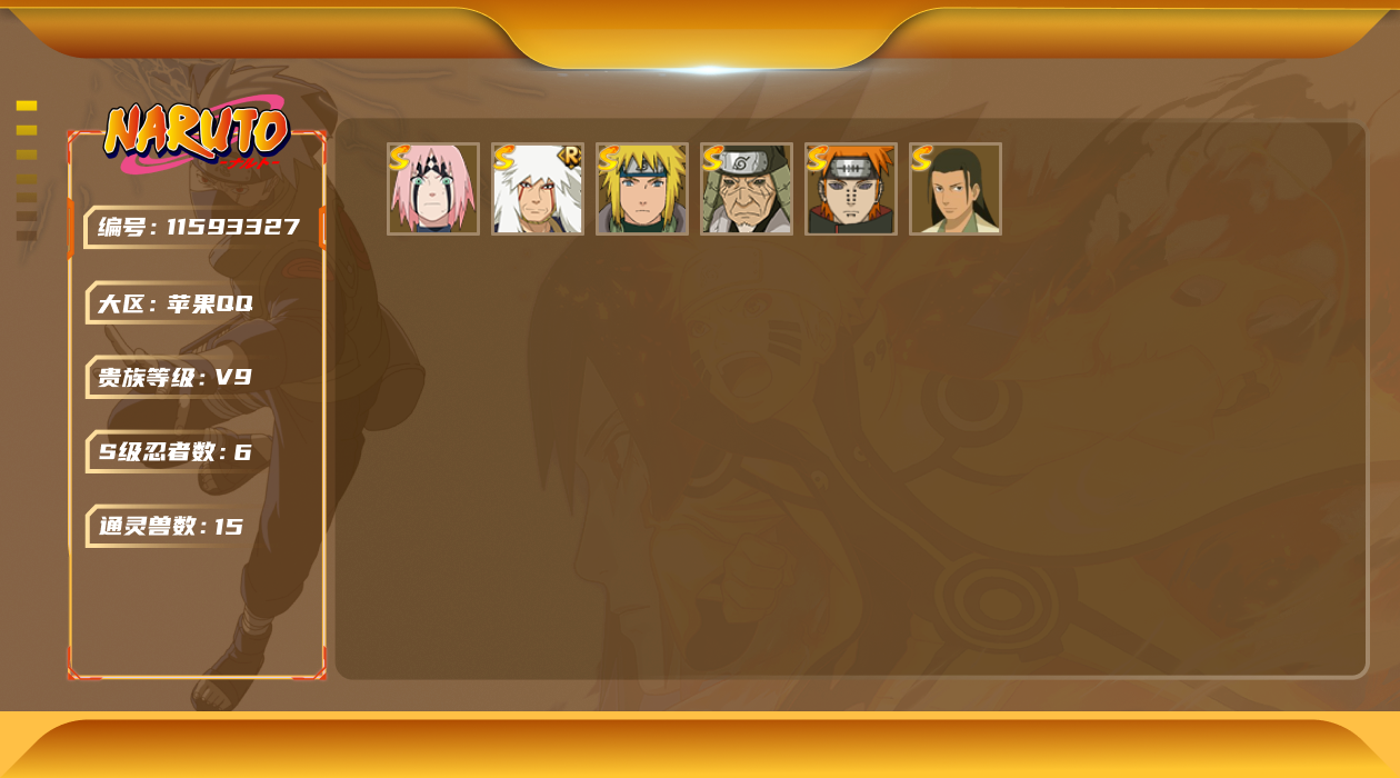 [11593327]V9 6S忍 18A忍 15通灵 423.3W战力 可二次 可修改实名 优质装备:熊猫,猿飞日斩「秽土转生」,春野樱 「忍界大战」,千手柱间·木叶创立 S级忍者:自来也 「舞之豪杰」,佩恩「天道」,波风水门