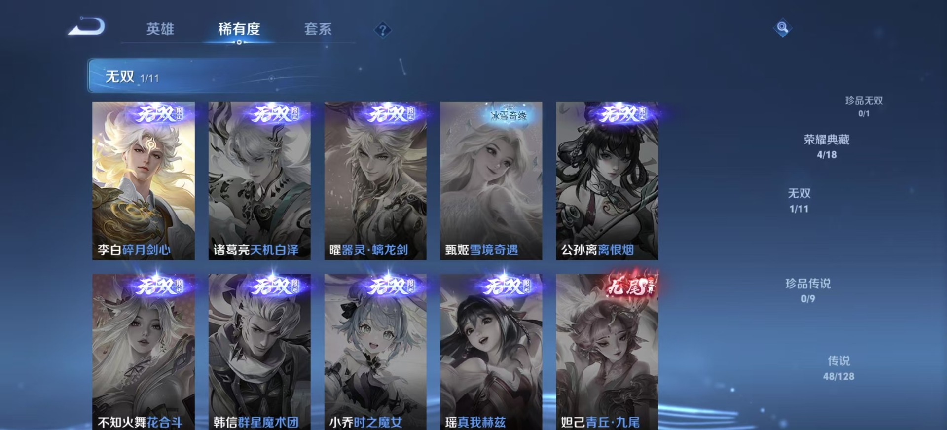 - PX_2083179-38 安卓QQ/最强王者/288皮肤/124英雄/1典藏/1珍品无双/2无双/6珍品传说/31传说/79史诗/9稀有英雄 【1 珍品无双】馥梦繁花, 【6 珍品传说】酷洛米之心 安琪拉,大耳狗之梦 瑶,朽木白哉 暃,黑崎一护 宫本武藏,器灵·落星盏 嫦娥,兔狲·蓬尾 张飞, 【1 典藏皮肤】最初的交响 伽罗, 【2 无双皮肤】时之魔女 小乔,器灵·螭龙剑 曜, 【31 传说皮