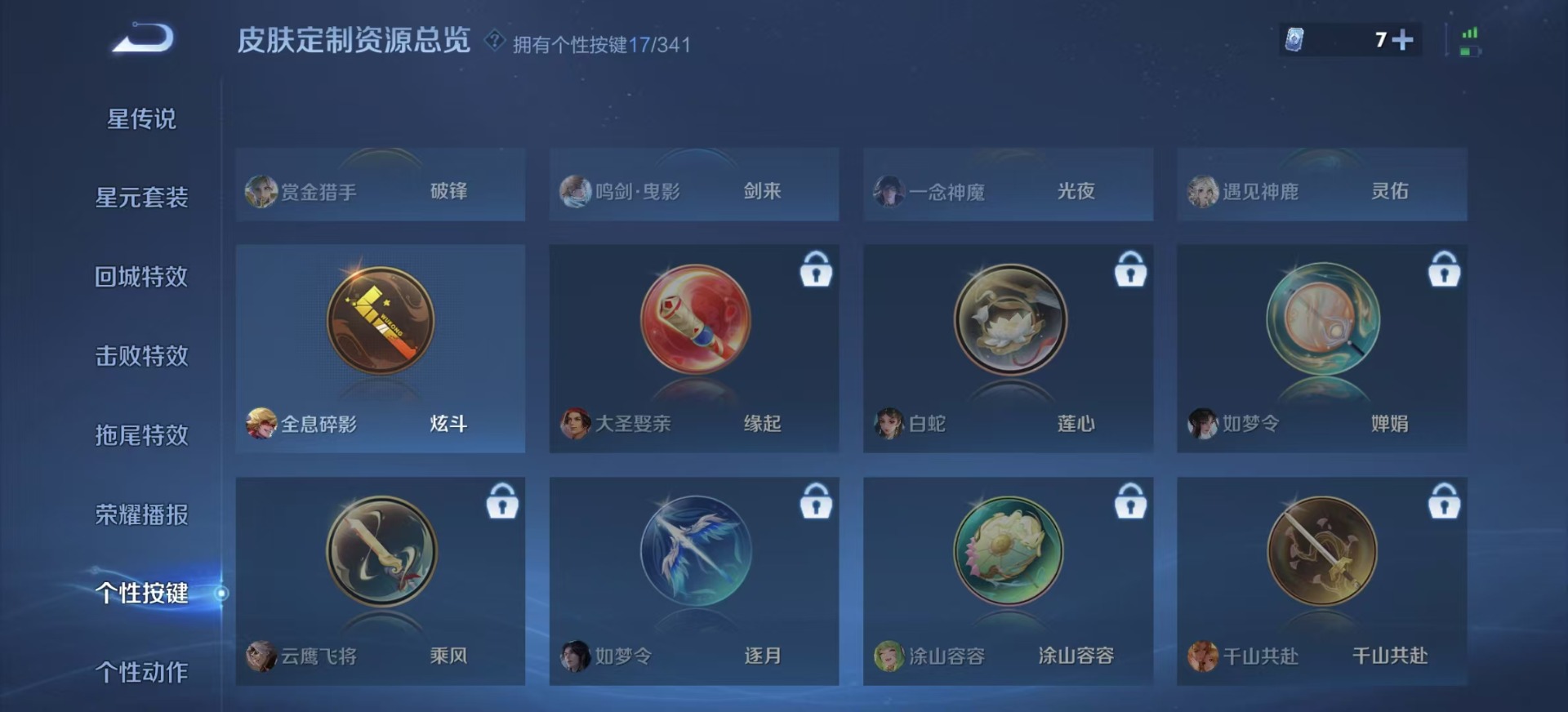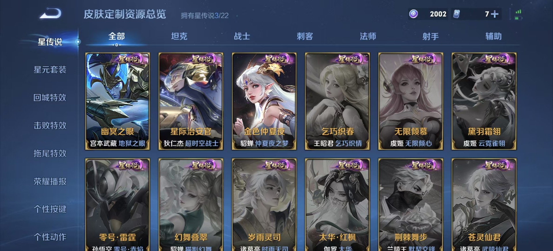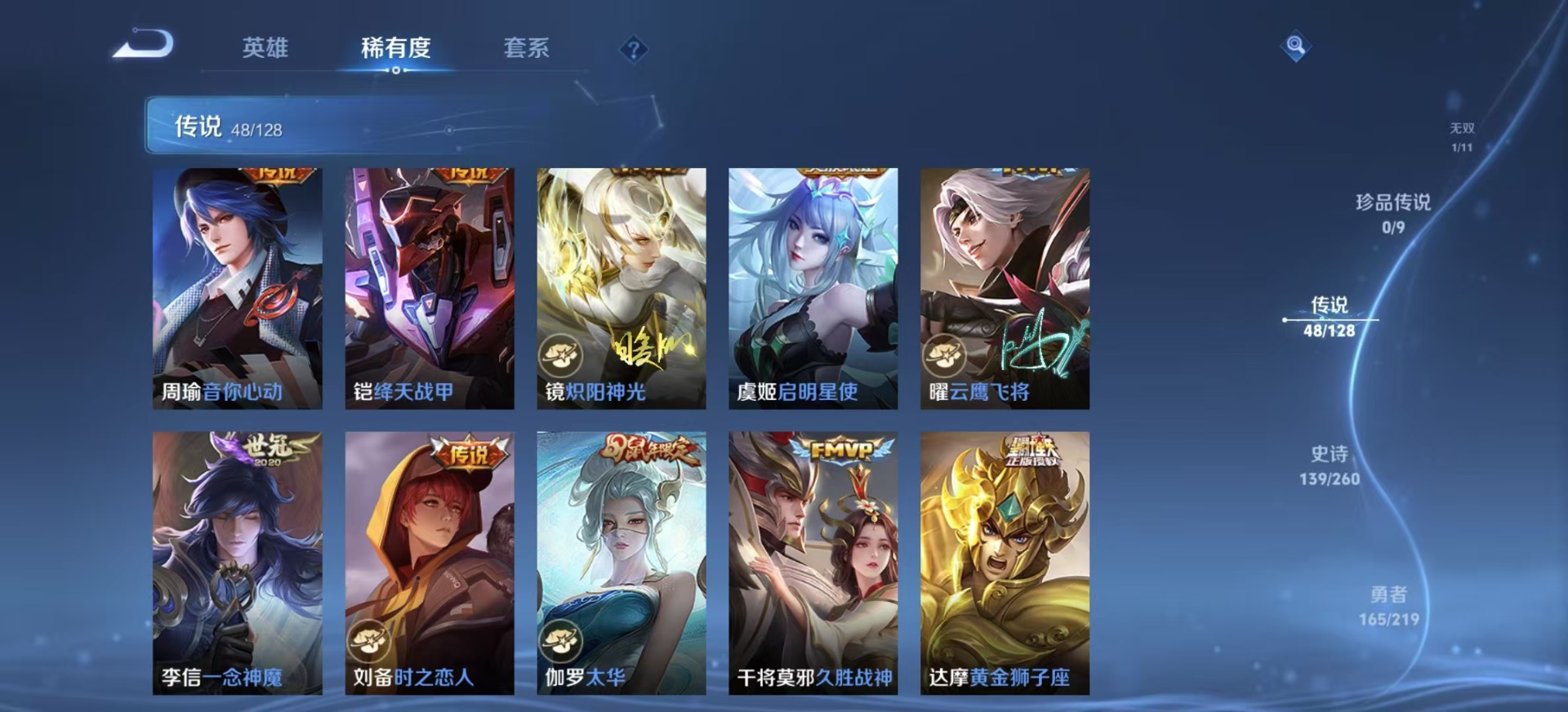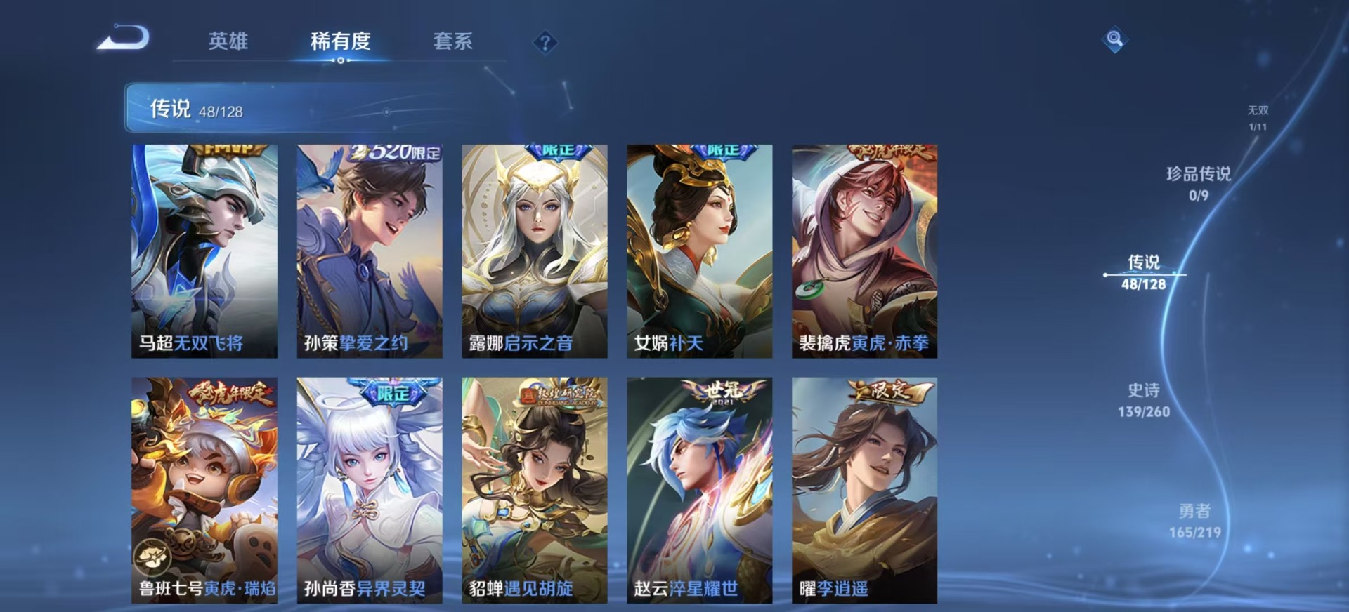 - PX_2054271-贵族等级: V7 英雄数: 117 皮肤数: 160 荣耀水晶: 神鉴启示录 无双皮: 雪境奇遇-甄姬 传说皮: 浮生妄,幻光神枪 限定皮: 李小龙,游园惊梦,梁祝,至尊宝,高山流水,孙行者,傲雪梅枪,五谷丰年,降魔,愿照·众生和,愿照·山河定,愿照·岁时盈