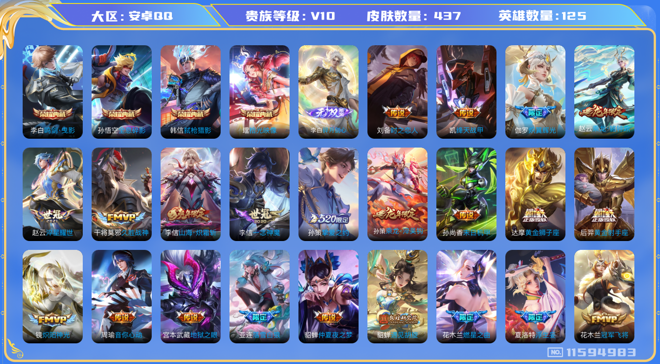 [11594983]V10 4典藏 1无双 48传说 125英雄 437皮肤 可修改实名 优质装备:鸣剑·曳影,全息碎影(猴子典藏),弑枪猎影(韩信典藏),碎月剑心(李白无双),拾光映像(瑶典藏),黄金狮子座,黄金射手座,冠军飞将,云鹰飞将(小将军),绛天战甲(鸡嘴战神),久胜战神,炽阳神光,一念神魔,末日机甲-孙尚香(绿蚂蚱),仲夏夜之梦(大飞蛾),地狱之眼,音你心动-周瑜,李逍遥,时之恋人-刘备(电焊工),淬星耀世,超时空战士-狄仁杰,遇见胡旋,挚爱之约,无双飞将,碎云,神器·狴犴令,山海·炽霜斩(李信年限),山海·苍雷引(电光曜子),炽翼辉光(娃娃菜牛角包),燃星之曲,浮生妄,艾琳觅芳踪,涂山容容 传说皮:乘龙·铭钟鼎(赵云年限),乘龙·淬吴钩(孙策年限),落雪白狼,续相思 珍宝阁皮:妄想食味,女武神,玩趣恶龙 限定皮:愿照·千秋盛(女娲年限),鸣野蒿,凤求凰(白切鸡),凤凰于飞,太华(伽罗年限),武陵仙君(小桃花),异界灵契(白毛香),傲雪梅枪,补天,星穹之声,神威(电光马子),飞衡(韩信年限),瑞麟志(木兰年限),至美·乘鲤谣,遇见飞天,高山流水,诗剑行,齐天大圣,匿光决锋者,怒海麟威,降魔,五谷丰年,青龙志(铠年限),梁祝,御风骁将(吕布年限),烈魂,天狼绘梦者,逐梦之影,朱雀志(守约年限),孙行者,蜜橘之夏,匿光追影者,寅虎·御盾(廉颇年限),寅虎·瑞焰(虎皮蛋子),寅虎·赤拳(老虎年限),百木心枪,玉兔公主,启示之音,无尽星芒,深海之息(深海大菠萝),唐三藏,匿光启智者,神器·万象笔,山海·玄木吟(马可年限) 史诗皮:赞萌露比,鸭鸭历险记-刘禅,化蝶舞,灵蛊蚀心,星界战将,谪仙醉月,龙之律动,石田雨龙,百相守梦-周瑜,茶境仙,幻珠鲛人,怒海争锋,破空之剑,蔬乡物语(鲁班七号),百相守梦-黄忠,织梦人,遇见神鹿,紫霞仙子,苍穹之光,电玩小子(小书包),白龙吟,黄金分割率,特工魅影,千年之狐,永昼,江河有灵,鹤归松栖(赵怀真),魅语,百解令(蒙犽),高渐离燃音魔法,蒙恬荣光圣徽,冰冠公主,青蛇,偶像歌手,晚萤,电玩·爆裂旋风,暗夜猫娘,龙骑士(小龙虾),末日机甲-吕布,猫狗日记-孙策,猫狗日记-大乔,时之恋人-孙尚香,乱世虎臣,节奏热浪,修罗,女仆咖啡,摇滚巨星,水果甜心,绅士熊喵,天才门将,星夜王子,心灵骇客,时之奇旅-安琪拉,功夫厨神,德古拉伯爵,暗隐猎兽者,幽灵船