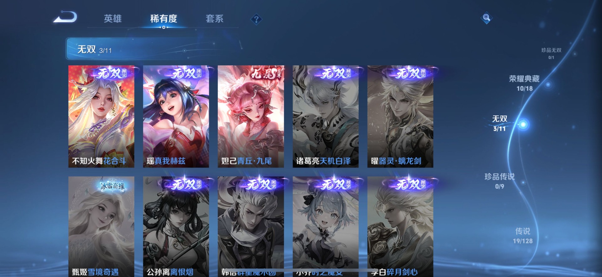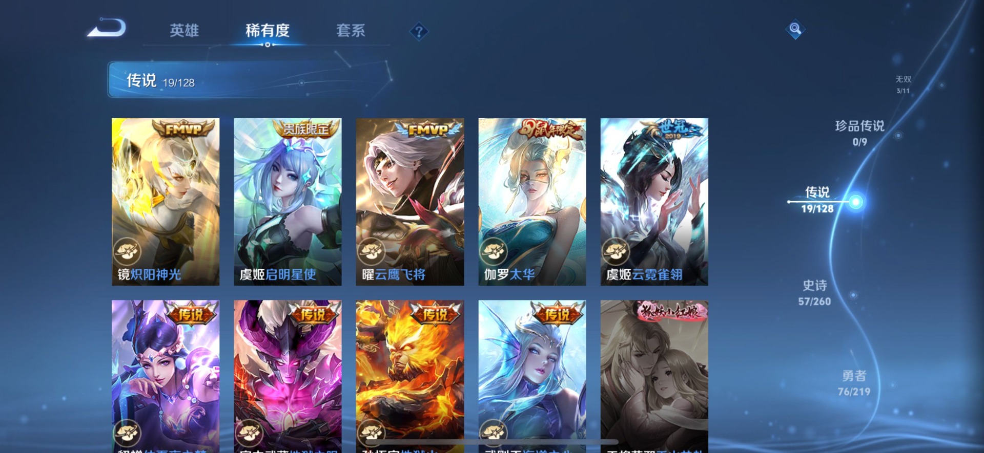 - PX_2074641-40 安卓QQ/非凡王者/312皮肤/123英雄/2典藏/0珍品无双/0无双/1珍品传说/19传说/85史诗/8稀有英雄 【1 珍品传说】怪盗基德 马可波罗, 【2 典藏皮肤】全息碎影 孙悟空,银白咏叹调 铠, 【19 传说皮肤】枫霜尽 橘右京,胖达荣荣 梦奇,启明星使 虞姬,前尘镜 娜可露露,飞鸢探春 李元芳,零号·赤焰 孙悟空,齐天大圣 孙悟空,深海之息 马可波罗,诗剑行
