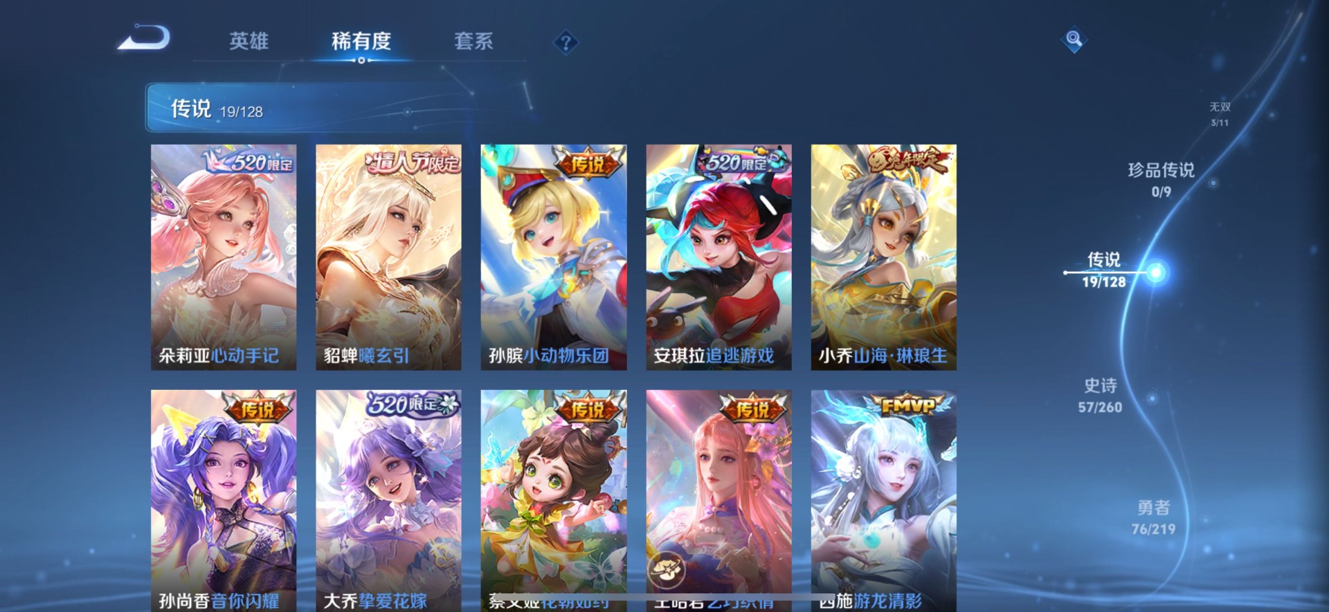 甄姬幽恒,甄姬女儿国国王,伽罗太华,露娜一生所爱,庄周玄嵩,安琪拉魔法小厨娘,盘古冰霜神祇,妲己时之彼端,妲己时之奇旅,瑶山海·碧波行,王昭君凤凰于飞