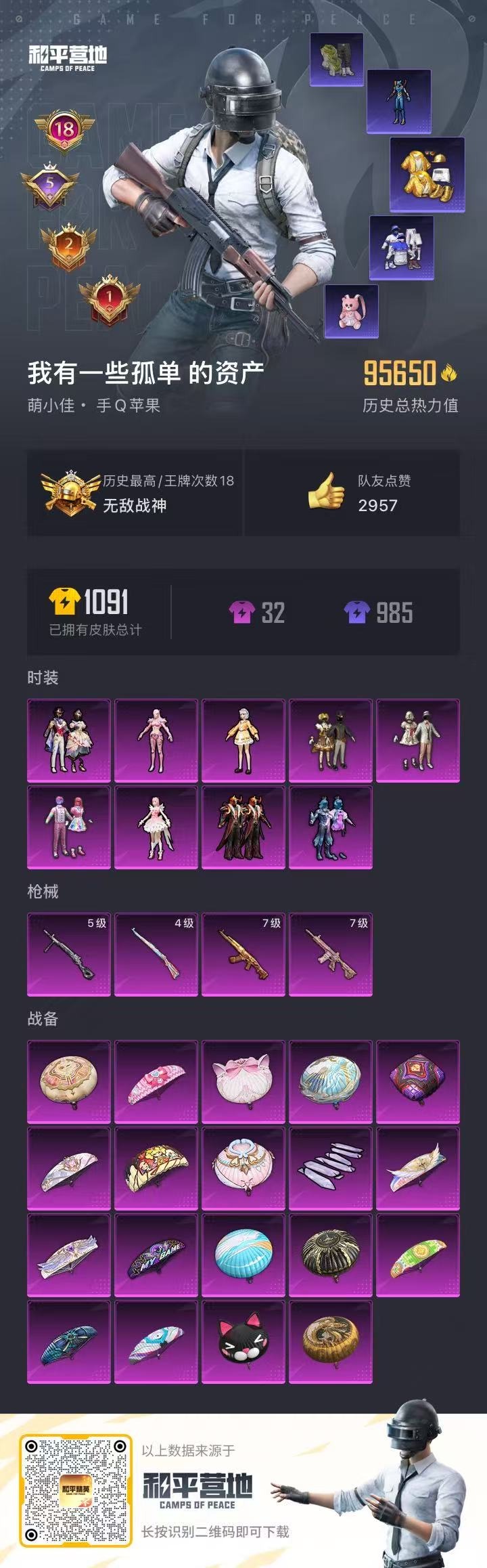 [11596866]9粉装 4特效枪 18印记 可二次 可修改实名 身法装备:舞王派对(派对舞王、小金鞋),Mark.06(新蓝螳螂),萌熊伴侣背包(粉熊背包) 优质装备:甜心巧克力,舞王派对(派对舞王、小金鞋),萌熊伴侣背包(粉熊背包),AKM甜心宝贝,M416心之恋语,深海曼妙,宝贝奶油派,天使彩虹糖,七级M416-心之恋语,七级AKM-甜心宝贝,星穹咏叹调,Kar98K-巳巳如意 热门装扮:炙焰牛王,呆萌星弥,美雪,守护天翼,恶魔喵喵,大橘为重,迅捷狂鲨,派对舞王(小金鞋) 稀有枪皮:DP-28-豹影疾电 五级特效枪:五级DP-28-豹影疾电 四级特效枪:四级Kar98K-巳巳如意 紫色装扮:田园牧歌,轻风白浪,SS22特训,SS23特训,幻彩翩翩,妙红点点,照水倚天,娇憨猪猪,萌趣咩咩,SS21特训,SS31特训套装,SS5特训,冰川特警,冰焰天使,凛冬战士,北国孤狼,旭日情侣,SS30特训套装,云朵鹅,雪绒豹,SS33特训套装,青涩时光,SS20特训,潮流游乐家,SS15特训,暗夜傀儡,蝎王蛇后,迪迦奥特曼,时空追击者,暴风机械师,SS16特训,银白舞王,SS13特训,猎梦纪元,飞驰魅影,音速流光,SS19特训,军刀雅典娜,甜心亚梦,虚音幻奏,瑞龙福将,团圆交子,醒狮腾龙,SS17特训,炫光向阳,异彩先驱,SS18特训,都市魅力,野性山猫,野性战魂,长空猛禽,雪山征服者,雪山精英,霓虹极客,霓虹街区,青年教官,青春校园,迎春赐吉,缤纷果语,耀眼新星,荣耀,蓝色守护者,蓝色运动,街头潮人,跃动心情,龙腾端午,魅力单车,黄色伏地魔,黄色运动,黑色伏地魔,龙的传人,龟仙人,冰河战士,龙魂突击队,蝶变,香桃花海,缤纷假日,沙漠毒蛇,极速红龙,柠萌假日,格斗先锋,沙漠兵团,海岛探路者,圣诞大吉,坚韧舞者,夏日倾情,夏日音浪,夜莺强袭者,幻世战舞者,战地菁英,探宝勇士,湖蓝色名流,绮丽涂鸦,疯狂小兔子,白色伏地魔,破蛋小黄鸡,神秘领域,甜蜜告白,福星高照,空岛之星,突袭者,竞技勇士朋克,竞技达人朋克,红色运动,甜蜜熊情侣,王牌教练,牛气冲天,灰色格斗者,灼焰舞者,炫蓝之夏,熔岩使者,燃烧卡路里,牛气满满,狂沙舞者,猎鹰,镭射皇者,小熊娃娃,雏菊兔兔,萝兰蝴蝶,SS29特训,拉斐尔,星途旅人,纯真浪花,热情海星,曼妙人鱼,SS28特训,甜酷狙击,Mark.06(新蓝螳螂),鱼渊荷华,玉兔