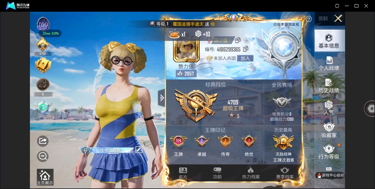 - PX_2095793-实名: 可修改 贵族等级: V3 英雄数: 90 皮肤数: 75 传说皮: 久胜战神,幻光神枪 限定皮: 鸣野蒿,愿照·岁时盈
