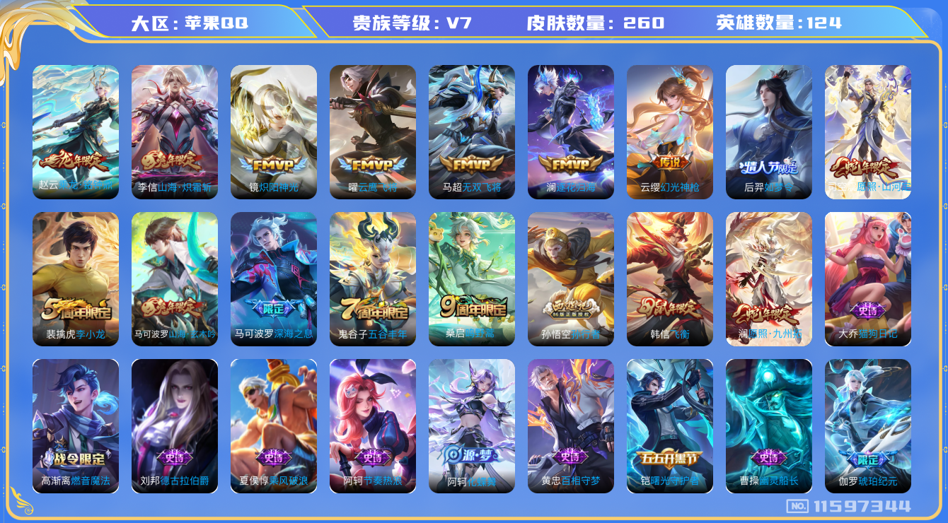 [11597344]V7 11传说 124英雄 260皮肤 可修改实名 优质装备:云鹰飞将(小将军),炽阳神光,无双飞将,山海·炽霜斩(李信年限),澜逐花归海 传说皮:乘龙·铭钟鼎(赵云年限),幻光神枪 珍宝阁皮:妄想食味,胡桃夹子,万物之道 限定皮:愿照·九州拓(澜年限),愿照·山河定(司空震年限),鸣野蒿,飞衡(韩信年限),五谷丰年,李小龙,如梦令-后羿,孙行者,深海之息(深海大菠萝),山海·玄木吟(马可年限) 史诗皮:器灵·浮梦炉,化蝶舞,星界战将,龙之律动,埋骨钱,蔬乡物语(鲁班七号),琥珀纪元伽罗,百相守梦-黄忠,紫霞仙子,苍穹之光,黄金分割率,特工魅影,千年之狐,匿光侦查者,江河有灵,雪夜绮愿(周瑜),百解令(蒙犽),高渐离燃音魔法,蒙恬荣光圣徽,偶像歌手,魅语,冰冠公主,末日机甲-吕布,猫狗日记-孙策,猫狗日记-大乔,节奏热浪,修罗,女仆咖啡,摇滚巨星,水果甜心,天才门将,星夜王子,心灵骇客,功夫厨神,德古拉伯爵,暗隐猎兽者,幽灵船长,鬼剑武藏,暗渊魔法,心灵战警,舞动绿茵,纤云弄巧,繁星吟游(呼啦呼啦),拒霜思,缤纷独角兽,乘风破浪,逐浪之夏,水晶猎龙者,曙光守护者,金属风暴,原初追逐者,圣诞狂欢,圣诞恋歌,鹰眼统帅,魅力维加斯,黎明之约,赏金猎手,未来纪元-赵云