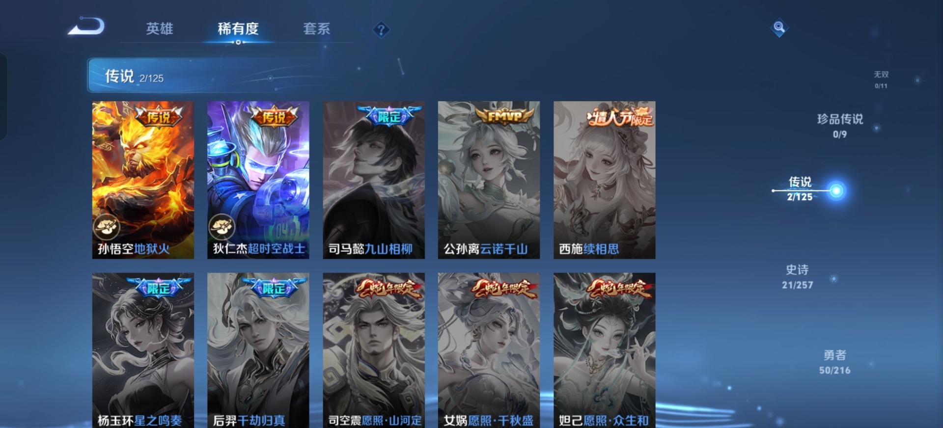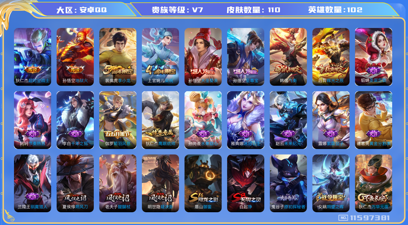 [11597381]V7 2传说 102英雄 110皮肤 可修改实名 传说皮:地狱火,超时空战士-狄仁杰 限定皮:至尊宝,飞衡(韩信年限),梁祝,李小龙,辉光之辰,大圣娶亲 史诗皮:紫霞仙子,黄金分割率,千年之狐,冰冠公主,节奏热浪,水果甜心,箭羽风息,圣诞恋歌,鹰眼统帅,未来纪元-赵云