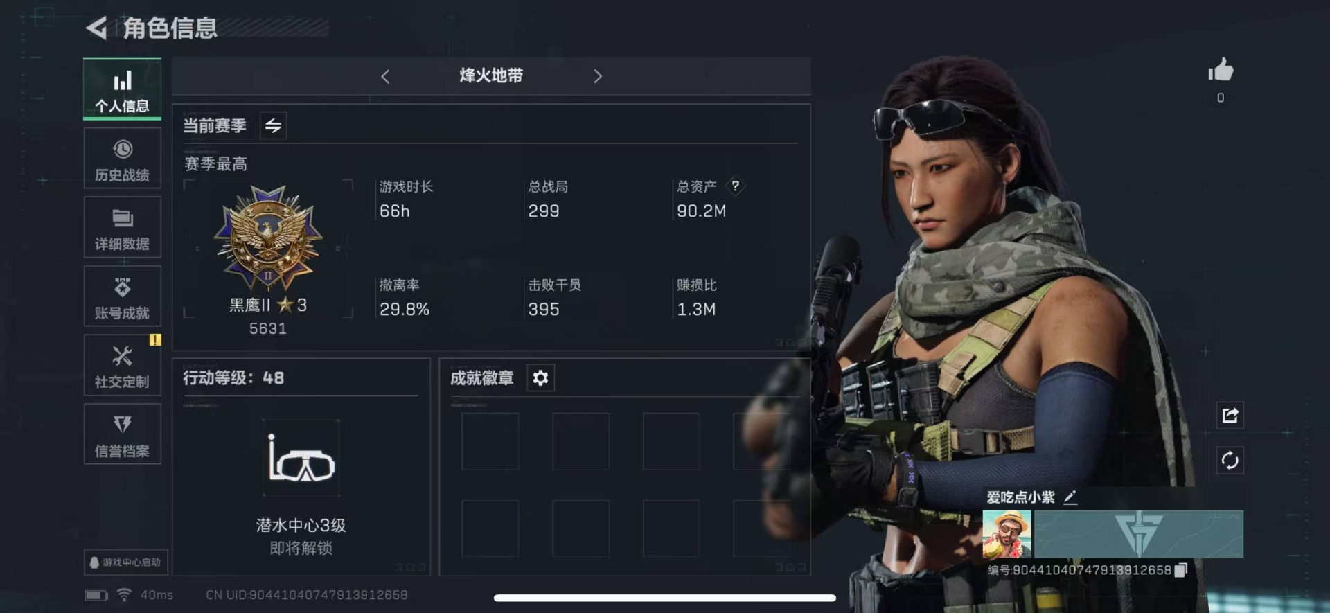 [11597374]总资产:90.2 3传说枪械 进阶安全箱(2×2)9.15号到期 可二次 可修改实名 烽火地带段位:黑鹰 全面战场段位:无段位 哈夫币:64.559 传说武器皮肤:复合弓-黑-天际线,CAR-15突击步枪-阿米娅,勇士冲锋枪-能天使-午夜邮差 史诗武器皮肤:M16A4突击步枪-竞赛选手,SV-98狙击步枪-囚徒