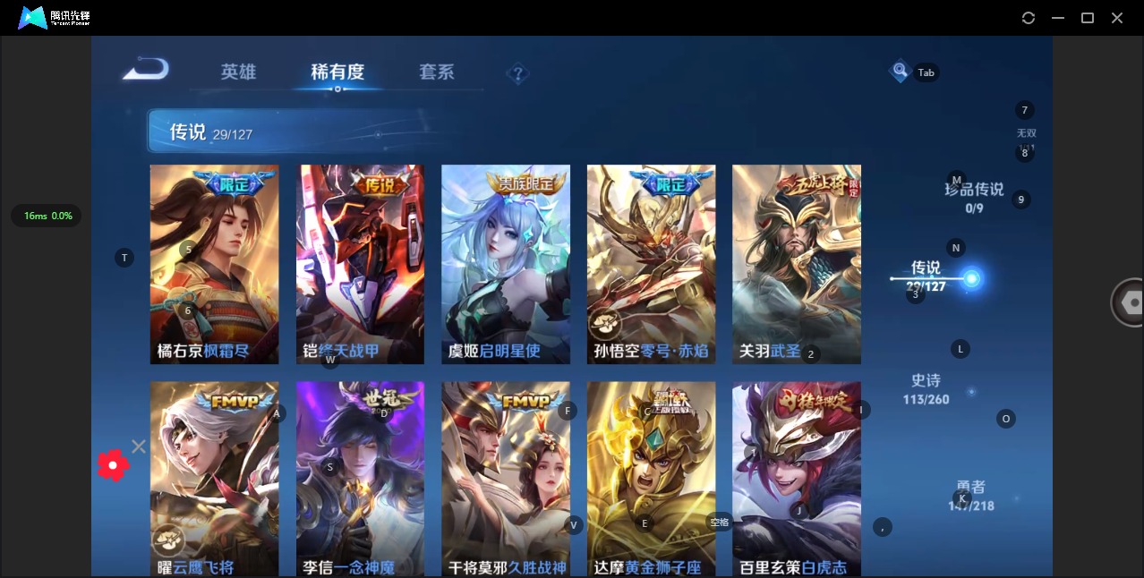- [11522655]V8 2典藏 31传说 125英雄 336皮肤 典藏英雄武则天 可修改实名 优质装备:鸣剑·曳影,九霄神辉(木兰典藏),黄金狮子座,黄金射手座,冠军飞将,云鹰飞将(小将军),绛天战甲(鸡嘴战神),猫影幻舞,一念神魔,末日机甲-孙尚香(绿蚂蚱),仲夏夜之梦(大飞蛾),零号·赤焰,海洋之心,地狱之眼,遇见胡旋,末日机甲-孙策,山海·炽霜斩(李信年限),惊梅引,霜月吟,玄雷天君 传说皮:落雪白狼 珍宝阁皮:妄想食味,优雅恋人,蔷薇恋人 限定皮:愿照·九州拓(澜年限),愿照·山河定(司空震年限),陌上桑,鸣野蒿,至尊宝,白虎志(电光耗子),凤求凰(白切鸡),武陵仙君(小桃花),异界灵契(白毛香),傲雪梅枪,白晶晶,时雨天司(水龙头),飞衡(韩信年限),瑞麟志(木兰年限),遇见飞天,高山流水,无限倾心-虞姬,五谷丰年,青龙志(铠年限),冰锋战神,武圣,游园惊梦,梁祝,御风骁将(吕布年限),天狼狩猎者,逐梦之音,李小龙,逐梦之影,朱雀志(守约年限),如梦令-后羿,霸王别姬-虞姬,默契交锋-花木兰,孙行者,猪悟能,一生所爱,大圣娶亲,天魔缭乱,青春决赛季 史诗皮:赞萌露比,器灵·浮梦炉,化蝶舞,灵蛊蚀心,龙之律动,石田雨龙,破空之剑,蒙犽顽岩魄,琥珀纪元伽罗,百相守梦-百里守约,守夜人,百相守梦-黄忠,紫霞仙子,电玩小子(小书包),白龙吟,黄金分割率,特工魅影,千年之狐,永昼,江河有灵,雪夜绮愿(周瑜),蒙恬荣光圣徽,龙骑士(小龙虾),暗夜猫娘,无限星赏官,冰冠公主,末日机甲-吕布,猫狗日记-孙策,猫狗日记-大乔,时之恋人-孙尚香,乱世虎臣,节奏热浪,修罗,女仆咖啡,摇滚巨星,水果甜心,绅士熊喵,天才门将,星夜王子,心灵骇客,功夫厨神,德古拉伯爵,暗隐猎兽者,幽灵船长,鬼剑武藏,心灵战警,天秀·启明,舞动绿茵,地狱岩魂,诗语江南,纤云弄巧,繁星吟游(呼啦呼啦),拒霜思,缤纷独角兽,乘风破浪,逐浪之夏,月团寄思,水晶猎龙者,曙光守护者,箭羽风息,金属风暴,原初追逐者,圣诞狂欢,圣诞恋歌,鹰眼统帅,暗夜贵公子,魅力维加斯,黎明之约,无心,未来纪元-赵云