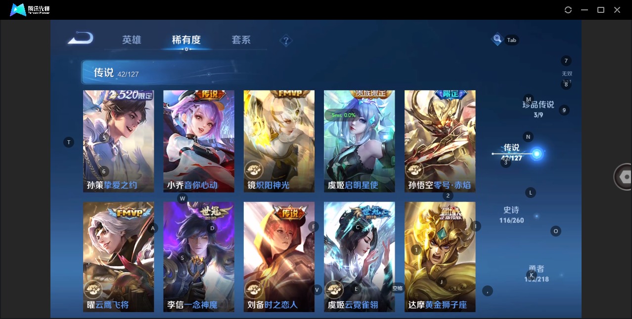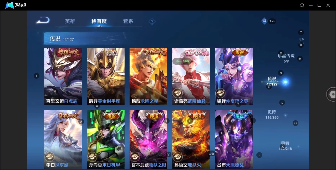 - [11658339]V8 1典藏 5传说 123英雄 211皮肤 可修改实名 优质装备:全息碎影(猴子典藏),黄金射手座,末日机甲-孙尚香(绿蚂蚱),地狱之眼,超时空战士-狄仁杰 珍宝阁皮:优雅恋人 限定皮:梅西,遇见飞天,冰锋战神,游园惊梦,天狼征服者,辉光之辰,霸王别姬-虞姬,青春决赛季,热情桑巴,神奇女侠 史诗皮:白龙吟,特工魅影,千年之狐,无限星赏官,冰冠公主,偶像歌手,暗夜猫娘,末日机甲-吕布,猫狗日记-孙策,水果甜心,星夜王子,心灵骇客,德古拉伯爵,幽灵船长,心灵战警,繁星吟游(呼啦呼啦),逐浪之夏,水晶猎龙者,箭羽风息,原初追逐者,圣诞狂欢,鹰眼统帅,王者之锤,暗夜贵公子,魅力维加斯,未来纪元-赵云