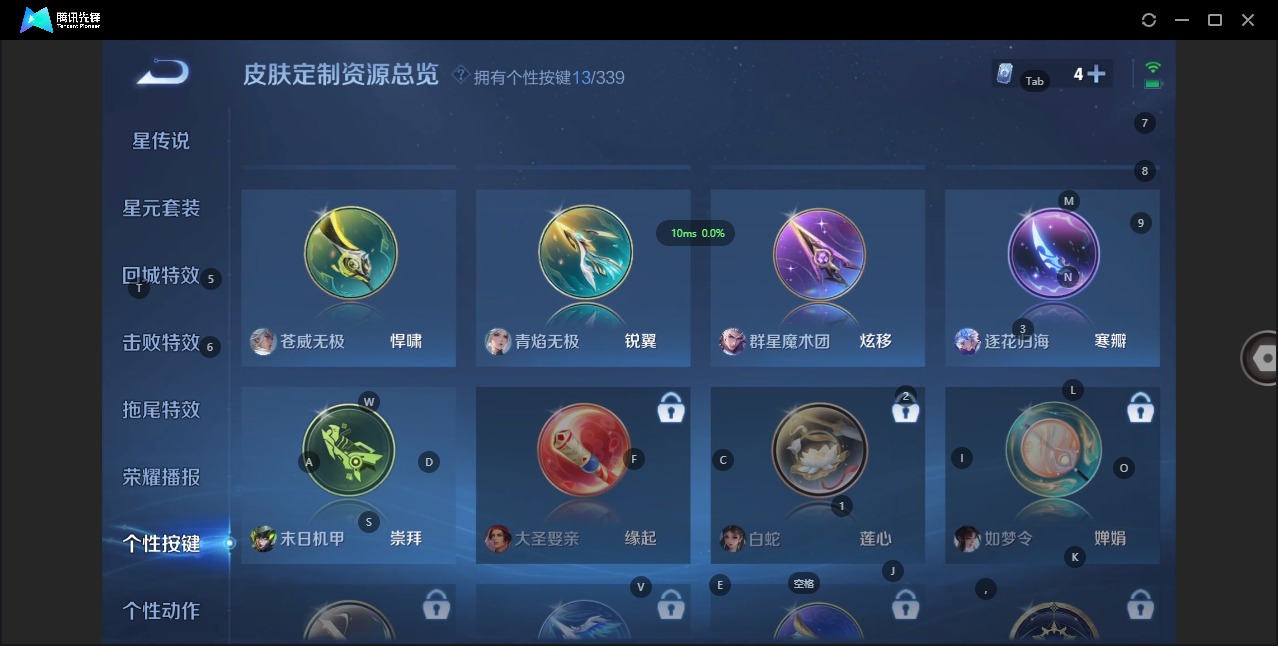 哪吒逐梦之翼,铠青龙志,苏烈玄武志,干将莫邪冰霜恋舞曲,后羿辉光之辰,露娜一生所爱,公孙离蜜橘之夏,裴擒虎梅西,貂蝉逐梦之音,裴擒虎李小龙,上官婉儿天狼绘梦者,花木兰默契交锋,花木兰青春决赛季,安琪拉魔法小厨娘,艾琳陌上桑,桑启鸣野蒿,猪八戒猪悟能,孙悟空孙行者,孙悟空大圣娶亲,孙悟空至尊宝,百里玄策白虎志,马超神威,雅典娜神奇女侠,赵云引擎之心,韩信逐梦之影,百里守约朱雀志,澜愿照·九州拓,虞姬霸王别姬,娜可露露前尘镜,关羽冰锋战神,橘右京枫霜尽