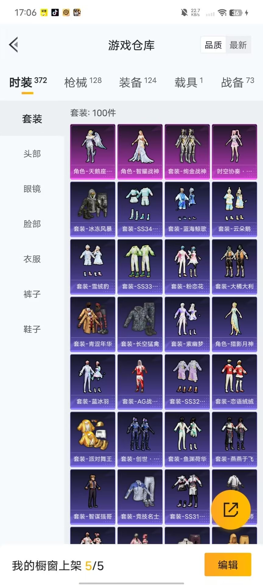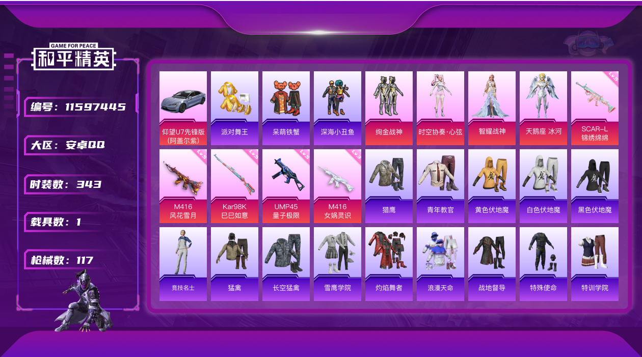 [11597445]4粉装 5特效枪 1载具 7印记 可二次 可修改实名 身法装备:舞王派对(派对舞王、小金鞋),暗影哥特(红眼罩),Mark.06(新蓝螳螂) 优质装备:仰望U7先锋版(阿盖尔紫),舞王派对(派对舞王、小金鞋),绚金战神,M416风花雪月,SCAR-L-锦绣绵绵,UMP45量子极限,时空协奏·心弦,M416-女娲灵识,智耀战神,天鹅座 冰河,Kar98K-巳巳如意 热门装扮:呆萌铁蟹,深海小丑鱼,派对舞王(小金鞋) 五级特效枪:五级UMP45-量子极限,五级Kar98K-巳巳如意,五级SCAR-L-锦绣绵绵,五级M416-风花雪月 三级特效枪:三级M416-女娲灵识 紫色装扮:SS22特训,SS23特训,SS21特训,SS31特训套装,云朵鹅,雪绒豹,SS33特训套装,SS20特训,音速流光,瑞龙福将,团圆交子,SS17特训,异彩先驱,SS18特训,都市魅力,长空猛禽,雪鹰学院,雷霆特警,霓虹极客,青年教官,青春校园,缤纷果语,街头潮人,青涩年华,蓝海鲸歌,魅力单车,鹤鸣,黄色伏地魔,黑色伏地魔,龙的传人,蝶变,极地朋克,柠萌假日,格斗先锋,暗金炫舞,深蓝色名流,清新柠檬,幻影武者,夏日倾情,战地督导,绮丽涂鸦,白色伏地魔,破蛋小黄鸡,空投萌叽,王牌教练,灼焰舞者,猛禽,特殊使命,特训学院,猎鹰,小熊娃娃,雏菊兔兔,萝兰蝴蝶,SS29特训,湖畔霞光,星途旅人,创世·幻影,白光莹,纯真浪花,热情海星,SS28特训,Mark.06(新蓝螳螂),光矢逐梦,鱼渊荷华,燕燕于飞,巳巳如意,竞技名士,暗影哥特(红眼罩),惊鸿侠骨,SS25特训,锦衣飞扬,粉红小猪,SS27特训,浪漫天命,SS26特训,春光漫游,快闪甜心,智谋强哥,大橘大利,耀粉歌者,粉恋花,蓝冰羽,紫幽梦,SS32特训服(SS32特训套装),猎影月神,恋语绒绒,冰冻风暴,光之冒险 优质战备:创世·救赎降落伞,星空武士降落伞,千金淑猫降落伞,荧海星豚降落伞,鬼刀降落伞,智耀战神降落伞,彩虹独角兽降落伞,千面幻镜降落伞,炫光之旅降落伞,齐天大圣降落伞