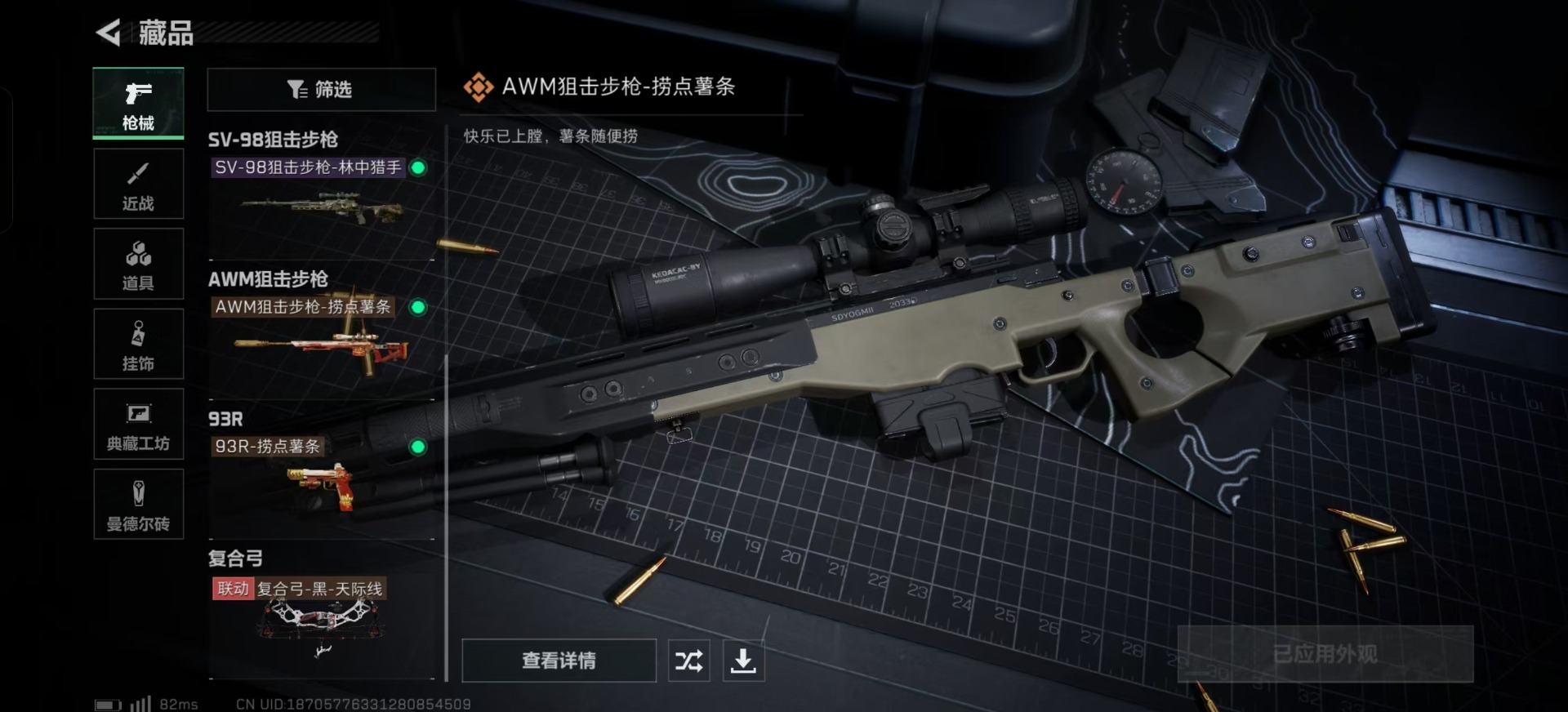 [11597502]总资产:81.6M 5传说枪械 哈夫币:10.968K 可二次 可修改实名 烽火地带段位:青铜 全面战场段位:无段位 传说武器皮肤:复合弓-黑-天际线,AWM狙击步枪-捞点薯条,腾龙突击步枪-捞点薯条,93R-捞点薯条,勇士冲锋枪-能天使-午夜邮差 史诗武器皮肤:SV-98狙击步枪-林中猎手,M250通用机枪-囚徒
