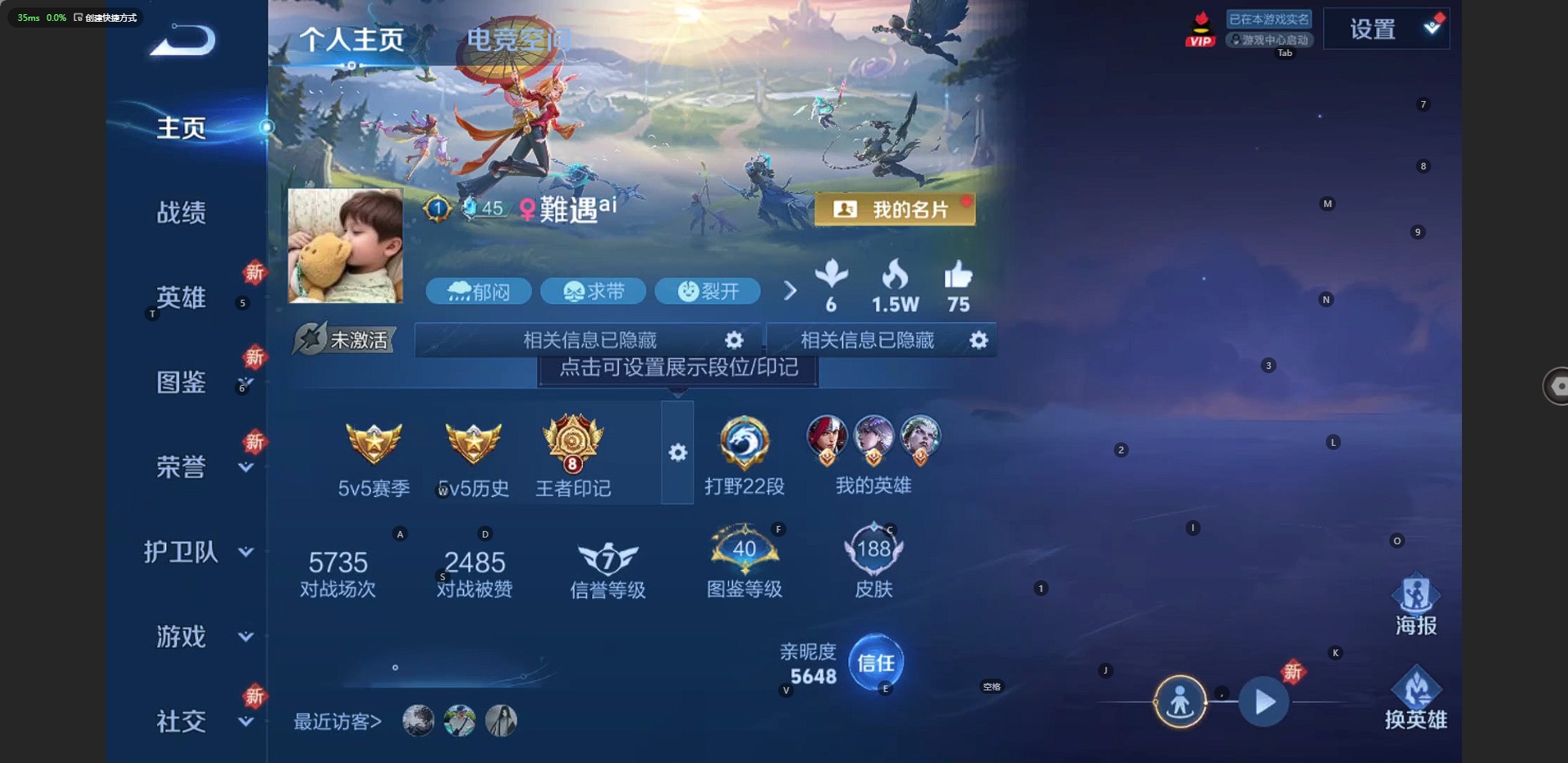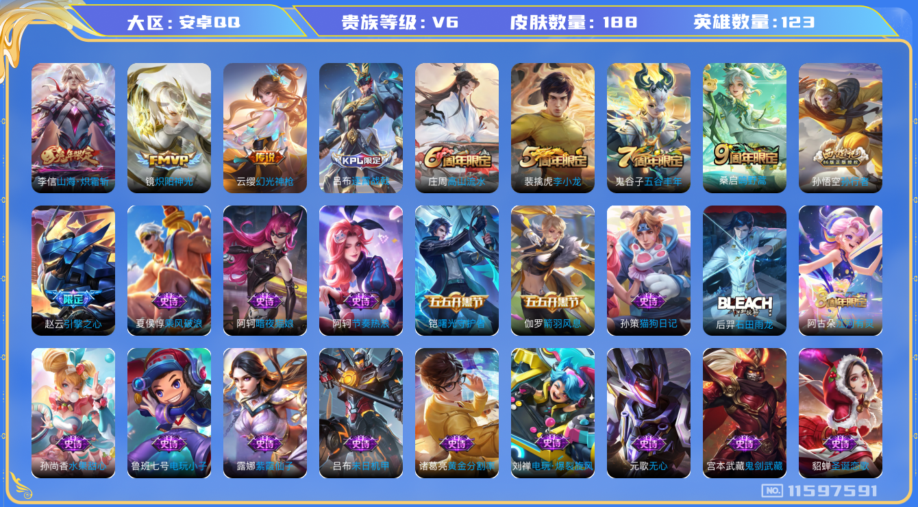 - [12203471]V7 1典藏 5传说 125英雄 214皮肤 可修改实名 优质装备:鸣剑·曳影,云鹰飞将(小将军),超时空战士-狄仁杰,碎云,涂山容容 传说皮:九山相柳 珍宝阁皮:妄想食味,优雅恋人 限定皮:逐霄战戟,陌上桑,鸣野蒿,遇见飞天,五谷丰年,梁祝,朱雀志(守约年限),山海·玄木吟(马可年限) 史诗皮:龙之律动,石田雨龙,百相守梦-周瑜,幻珠鲛人,琥珀纪元伽罗,蔬乡物语(鲁班七号),百相守梦-百里守约,百相守梦-黄忠,织梦人,守夜人,紫霞仙子,黄金分割率,特工魅影,千年之狐,江河有灵,末日机甲-莱西奥,雪夜绮愿(周瑜),真我赫兹(百里守约),魅语,百解令(蒙犽),高渐离燃音魔法,蒙恬荣光圣徽,冰冠公主,青蛇,猫狗日记-孙策,猫狗日记-大乔,女仆咖啡,水果甜心,天才门将,星夜王子,心灵骇客,德古拉伯爵,暗隐猎兽者,鬼剑武藏,心灵战警,舞动绿茵,地狱岩魂,纤云弄巧,拒霜思,缤纷独角兽,乘风破浪,逐浪之夏,水晶猎龙者,曙光守护者,金属风暴,原初追逐者,圣诞恋歌,鹰眼统帅,魅力维加斯,黎明之约,滕王阁序,无心
