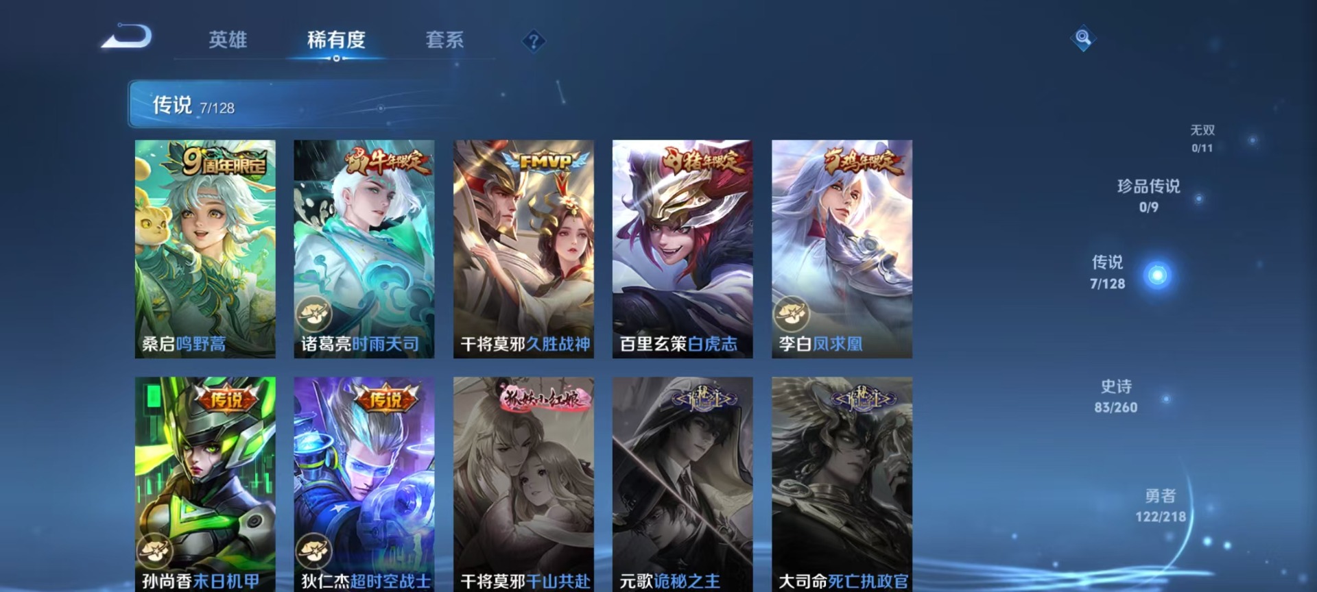 - [12317972]V7 1典藏 11传说 122英雄 211皮肤 可修改实名 优质装备:鸣剑·曳影,黄金狮子座,炽阳神光,一念神魔,末日机甲-孙尚香(绿蚂蚱),超时空战士-狄仁杰,无双飞将,澜逐花归海 珍宝阁皮:妄想食味,胡桃夹子 限定皮:愿照·九州拓(澜年限),愿照·山河定(司空震年限),鸣野蒿,遇见飞天,齐天大圣,五谷丰年,冰锋战神,逐梦之星,李小龙 史诗皮:星界战将,茶境仙,破空之剑,蔬乡物语(鲁班七号),百相守梦-百里守约,紫霞仙子,苍穹之光,白龙吟,特工魅影,千年之狐,江河有灵,魅语,蒙恬荣光圣徽,冰冠公主,青蛇,偶像歌手,电玩·爆裂旋风,猫狗日记-孙策,猫狗日记-大乔,节奏热浪,修罗,摇滚巨星,水果甜心,天才门将,星夜王子,功夫厨神,德古拉伯爵,暗隐猎兽者,幽灵船长,鬼剑武藏,天秀·启明,地狱岩魂,缤纷独角兽,乘风破浪,逐浪之夏,水晶猎龙者,金属风暴,原初追逐者,圣诞狂欢,圣诞恋歌,鹰眼统帅,魅力维加斯,黎明之约,无心,未来纪元-赵云