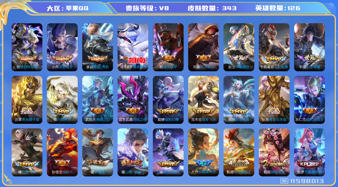 - PX_2077597-实名:,可修改,贵族等级:,V8,英雄数:,121,皮肤数:,278,荣耀水晶:,杀手不太冷,星传说:,幽冥火,金色仲夏夜,传说皮:,久胜战神,炽阳神光,一念神魔,地狱火,仲夏夜之梦,李逍遥,游龙清影,碎云,限定皮:,遇见飞天,李小龙,梁祝,引擎之心,天狼溯光者,神威,时之彼端,逐梦之音,青春决赛季,逐梦之星,凤求凰,美猴王,朱雀志,至尊宝,默契交锋-花木兰,高山流水,补天,