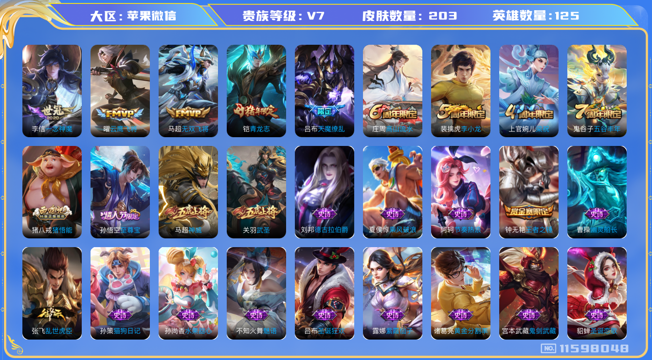 [11598048]V7 5传说 125英雄 203皮肤 可修改实名 优质装备:云鹰飞将(小将军),一念神魔,无双飞将 珍宝阁皮:蔷薇恋人,女武神 限定皮:至尊宝,神威(电光马子),高山流水,五谷丰年,青龙志(铠年限),武圣,梁祝,李小龙,猪悟能,天魔缭乱 史诗皮:龙之律动,紫霞仙子,白龙吟,黄金分割率,特工魅影,千年之狐,魅语,蒙恬荣光圣徽,猫狗日记-孙策,乱世虎臣,节奏热浪,女仆咖啡,摇滚巨星,水果甜心,德古拉伯爵,幽灵船长,鬼剑武藏,舞动绿茵,繁星吟游(呼啦呼啦),乘风破浪,水晶猎龙者,金属风暴,原初追逐者,圣诞狂欢,圣诞恋歌,鹰眼统帅,王者之锤,魅力维加斯,黎明之约,赏金猎手