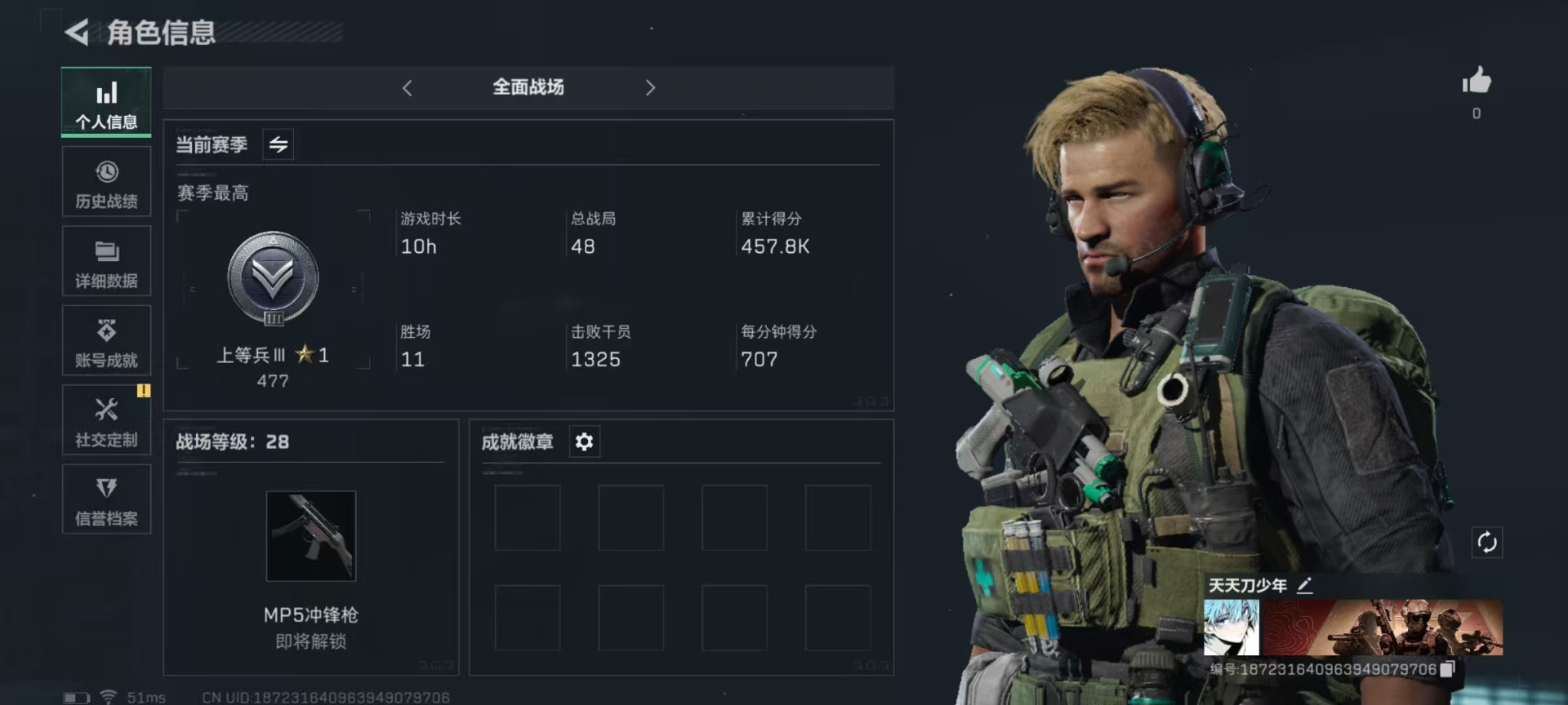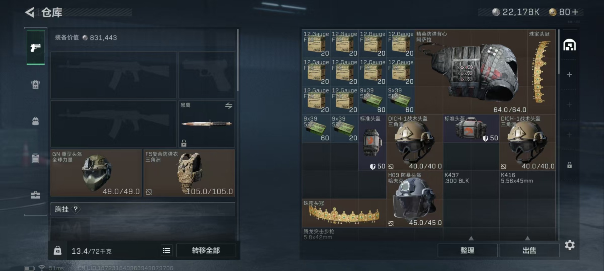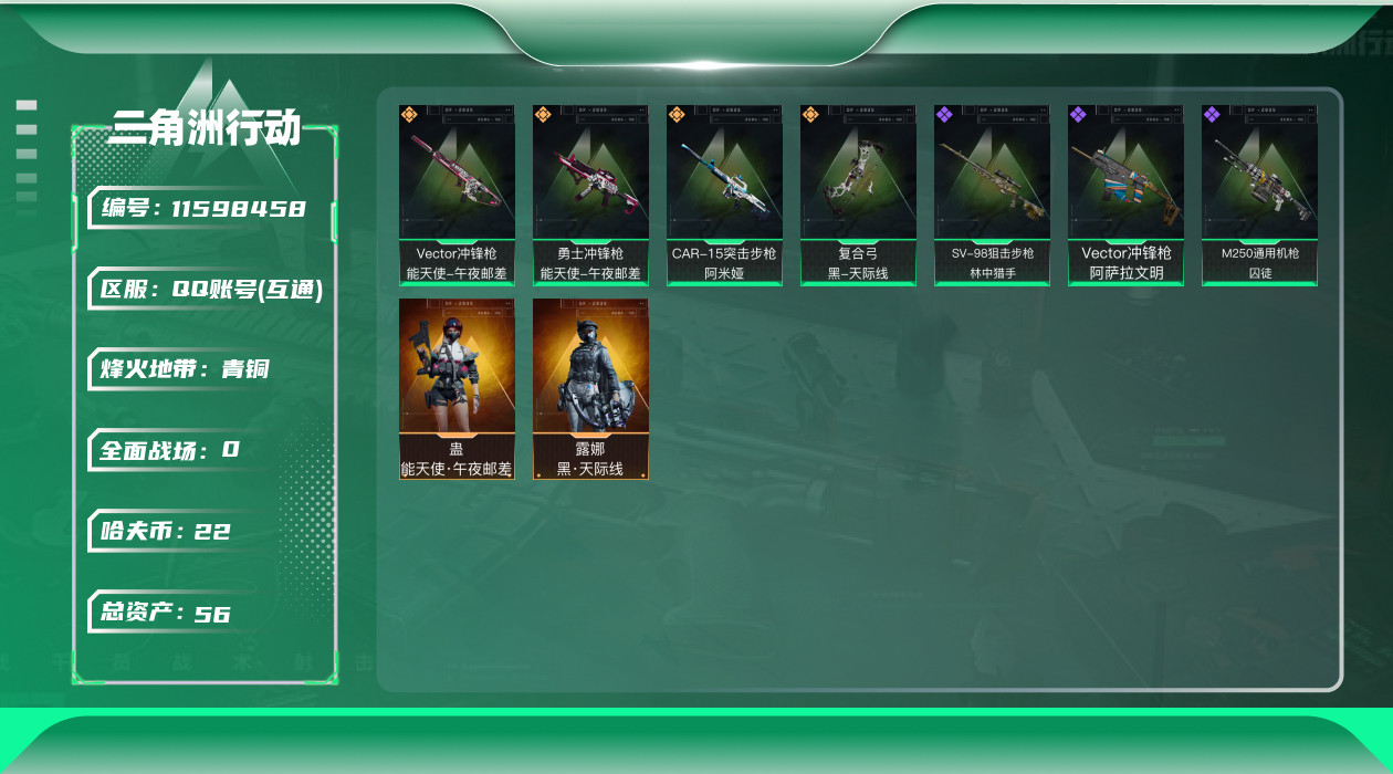 [11598458]总资产:56.3M 2干员外观 4传说枪械 哈夫币:22.178K 可二次 可修改实名 烽火地带段位:青铜 全面战场段位:上等兵 传说武器皮肤:CAR-15突击步枪-阿米娅,复合弓-黑-天际线,勇士冲锋枪-能天使-午夜邮差,Vector冲锋枪-能天使-午夜邮差 史诗武器皮肤:SV-98狙击步枪-林中猎手,M250通用机枪-囚徒,Vector冲锋枪-阿萨拉文明 干员外观:露娜-黑·天际线,蛊-能天使·午夜邮差
